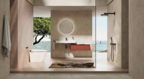 Roca乐家旗下多款套间系列淋漓尽致地展现了地中海式的多巴胺美学。Ona欧那套间,以柔和细腻的圆角线条与简洁流畅的轮廓,塑造出超高颜值的外观造型,再巧妙搭配清新淡雅的浅绿色小砖,仿佛将地中海地区独特的“向海文化”原汁原味地引入卫浴空间,让使用者能时刻感受到海洋的灵动与活力。Tura途光套间则另辟蹊径,选用温暖醇厚的红砖色调作为主调,精准捕捉地中海氛围的精髓,使得西班牙的自然风情与建筑美学在日常沐浴时光中完美交融。而Ohtake系列套间更是创意非凡,以曲线、波浪以及海洋律动为灵感源泉,浴缸的曲面设计仿若海平面的起伏,台盆的波浪形轮廓恰似自然流水的韵律,为用户营造出极致的卫浴享受。