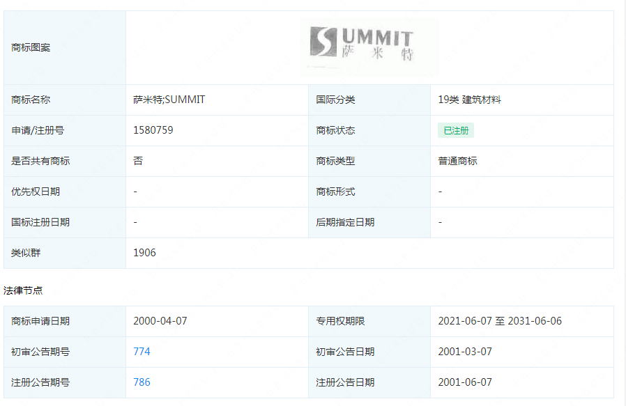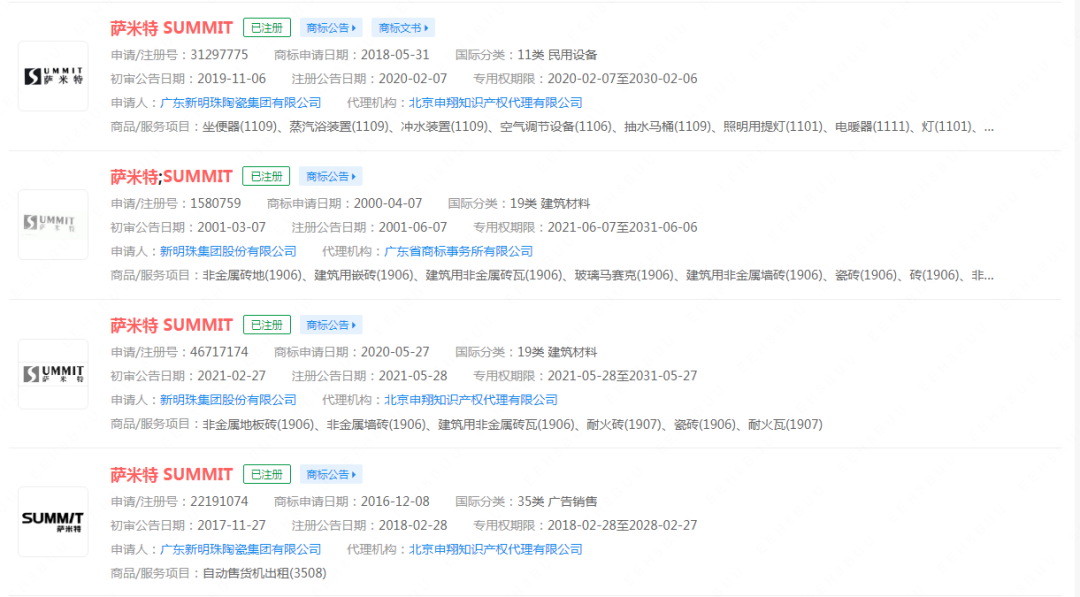 最终,苏某和所注册的萨米特商标被撤销。之后,新明珠陶瓷集团分别在第6类、第11类等类别上申请注册“萨米特SUMMIT及图”商标,以保护商标合法权益。