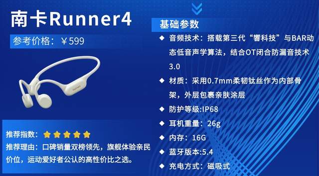推荐理由:作为骨传导耳机领域的技术先锋,南卡不断突破创新,手握多项骨传导专利技术,并针对骨骼传声原理进行深度专业调音,为运动用户带来越级优质音频体验。Runner4是南卡面向运动人群打造的明星旗舰机型,不仅延续品牌对音质与舒适的极致追求,在佩戴舒适度上更是做到同价位顶尖水平。