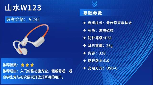 推荐理由:山水W123定位入门级水下运动骨传导耳机,主打高防水与本地存储,专为游泳、水中训练爱好者设计,凭借实用功能与亲民价格,成为入门水下运动人群的高性价比之选,兼顾基础陆地运动需求。