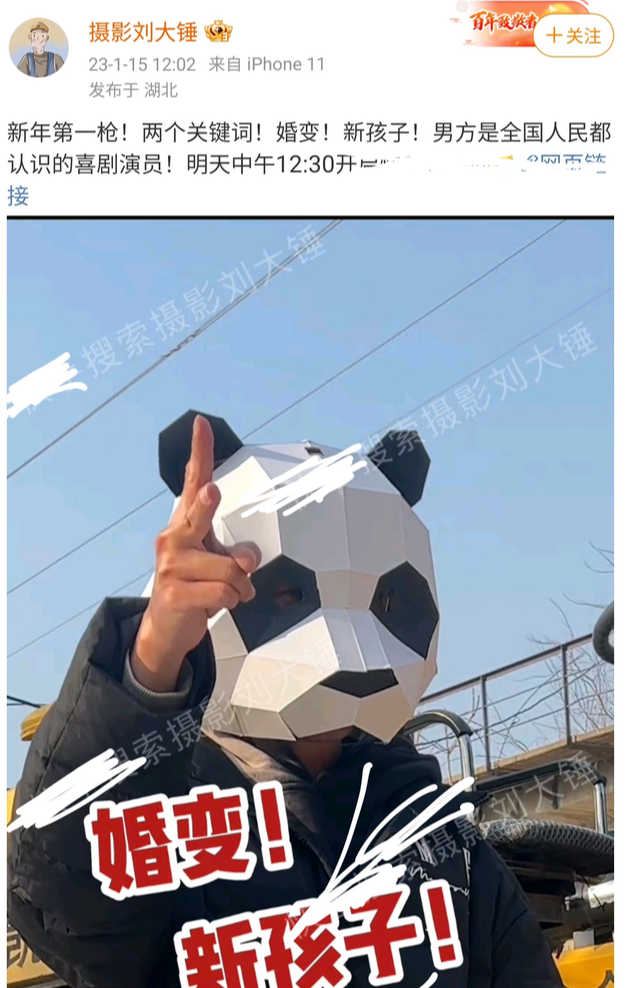 据悉 ,是狗仔刘大锤在自己账号上发布了“新年第一枪”,把枪口对准了某知名喜剧演员,狗仔说只有两个关键词,一个是婚变,这说明这位喜剧男演员是已经结婚的明星,第二个关键词是新孩子,说明这个男演员在大家不知道的情况下在外面有了私生子。