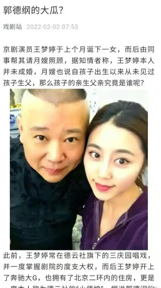 郭德纲和老婆王惠的恩爱故事喜欢德云社的人都早就听腻了,但大家可能不知道,郭德纲也被爆料出过和其他姑娘的绯闻,尤其是和京剧演员王梦婷的事情,许多老粉丝都吃过这个瓜。