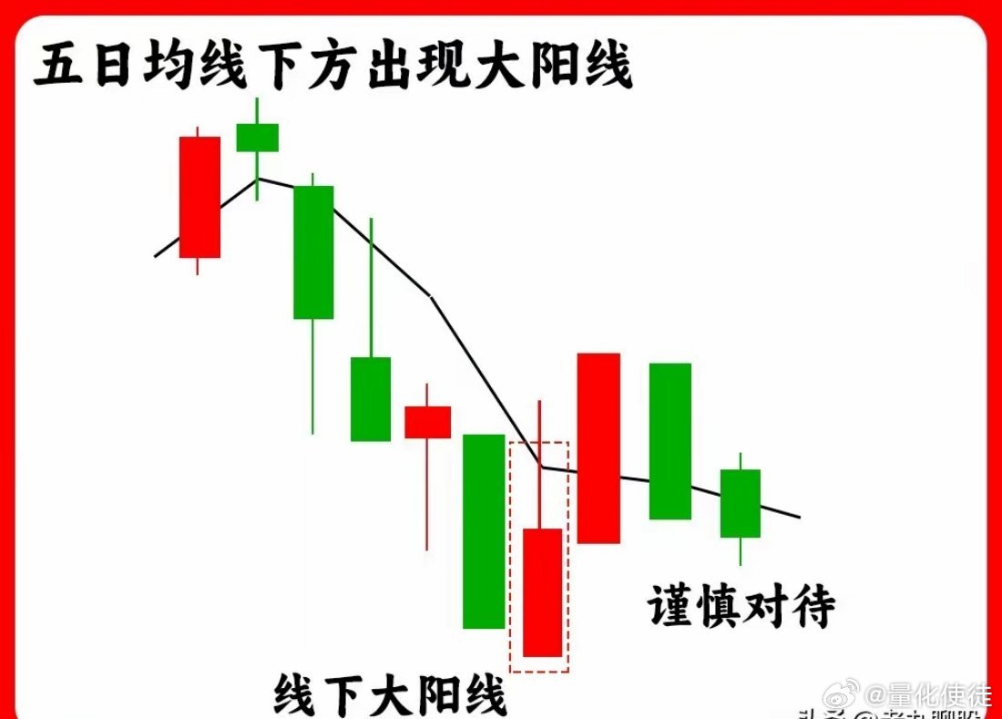 一、5日均线下方出现大阳线五日均线向下,处于短期下跌趋势,突然收出一根大阳线,说明股价有止跌迹象,但仅仅是反弹,趋势并没有反转,这种情况一定要谨慎。二、5日均线拐头向上均线从走平开始抬头向上,说明连续阳线推高股价,短期成本抬升,主力资金开始有所动作,短线转强信号。三、5日均线拐头向下均线从向上转为走平,再开始向下拐头,说明短期趋势由强转弱,市场平均成本下移,短线进入下跌节奏。四、5日均线下方出现小阳线均线向下,股价在均线下方收出小阳线,实体很小,说明多方力量偏弱,只是抛压有所减轻,并没有拉升动能。五、股价跌破5日均线上涨趋势中,5日均线一直托着股价上行,突然放量跌破均线,说明短期抛压加重,5日线作为重要支撑失效,要警惕回落。六、5日均线上方出现大阴线上涨途中收出大阴线,但股价没有跌破5日均线,这通常是主力强势洗盘,属于强分歧走势,次日表现非常关键。好了,以上就是五日均线最常见的六种形态,都是最基础、最实用的内容,一定要吃透。我们下期再见!