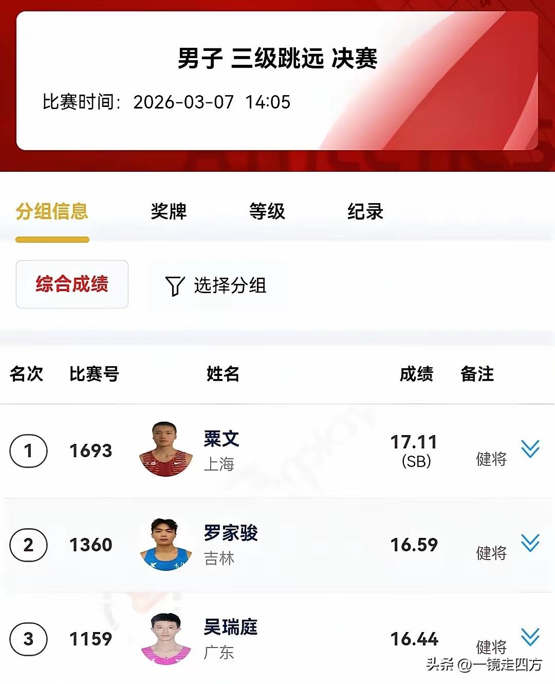今天下午进行的全国室内田径大奖赛西安站男子三级跳远决赛,上个月刚刚获得亚锦赛冠军的名将粟文在第三次试跳中直接跃跳出17.11米的个人赛季最好成绩,超过了16.90米的资格线,成功拿到下个月室内世锦赛的门票。