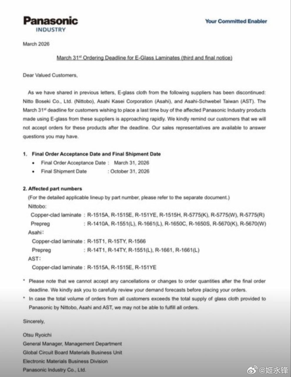 松下公司宣布,对于使用松下、Nittobo、旭化成和旭化成台湾(AST)提供的E级玻璃纤维布的部分CCL产品,最终订单截止日期为2026年3月31日。由于这些供应商已停止生产,稳定供应已无法实现。