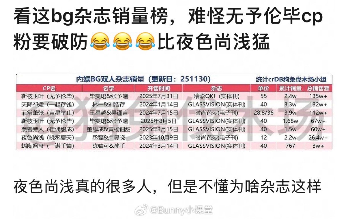 毕雯珺、张予曦的无予伦毕CP杂志销售额位列内娱BG双人杂志销量第一,难怪CP粉大骂毕雯珺……别的先不说,毕雯珺的单人杂志销量能在内娱排上号吗😅