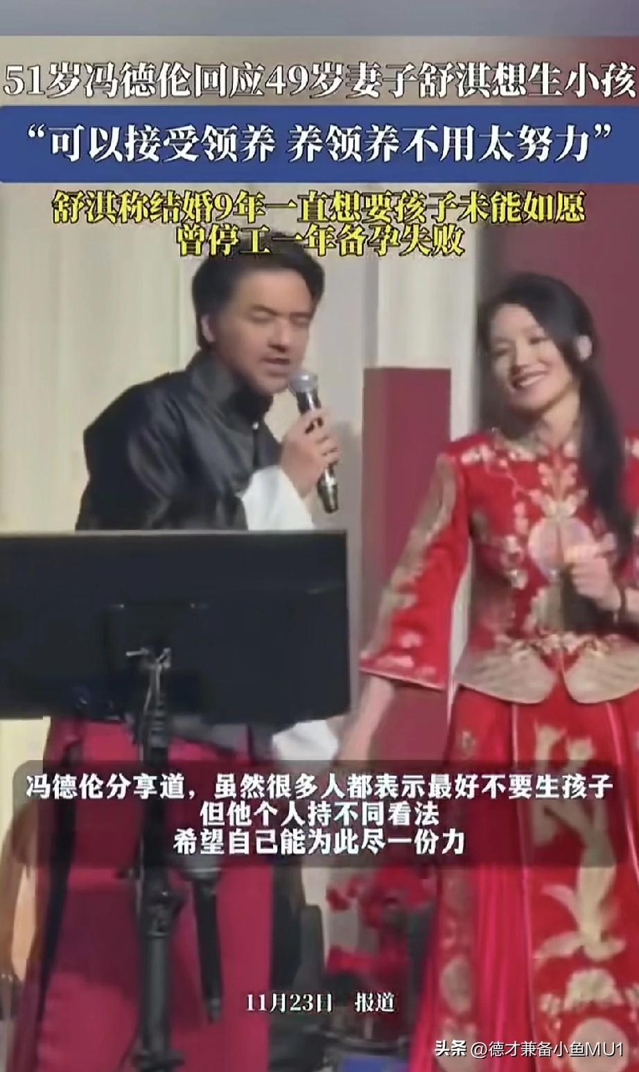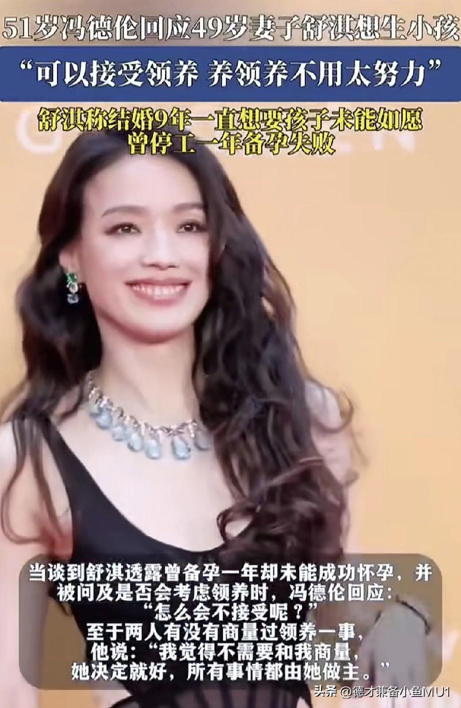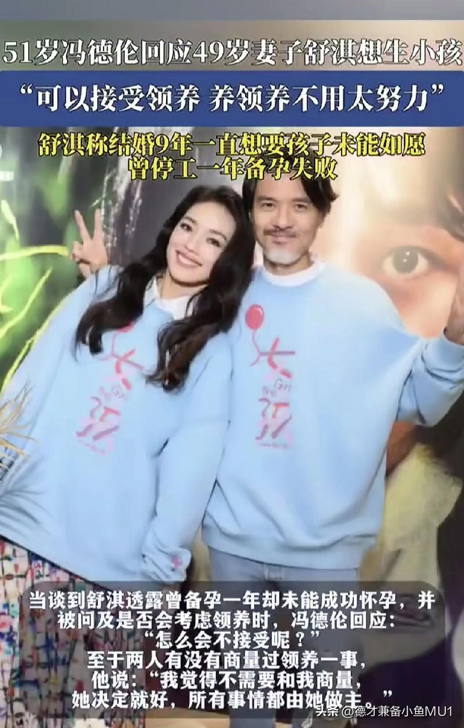 51岁冯德伦公开回应妻子舒淇想要孩子的想法,可以接受领养,领养养不用压力。 舒淇之前上节目时很多食物都不吃的,就喝点红酒。她的体质应该不是很好,而且她好像很容易过敏,我看过好多次她自己发的照片,脸上过敏妆都上不了,估计免疫系统也不好。 她的好朋友林心如结婚就很快生了女儿,她看着应该也是很羡慕。但是她的身体本身也没有林心如好,所以要想怀孕就很难。 常年为了保持身材,身体肯定不行,年轻时候的你都经历了什么?艺人不易,所以说找明星当丈夫和妻子,你要承担很多后果人生有舍有得,有得必有失,莫强求皆是命。 有网友说她又为了保持身材这不吃那不吃,为了工作不能怀孕估计也吃了不少药,结婚了想要孩子不那么容易的。