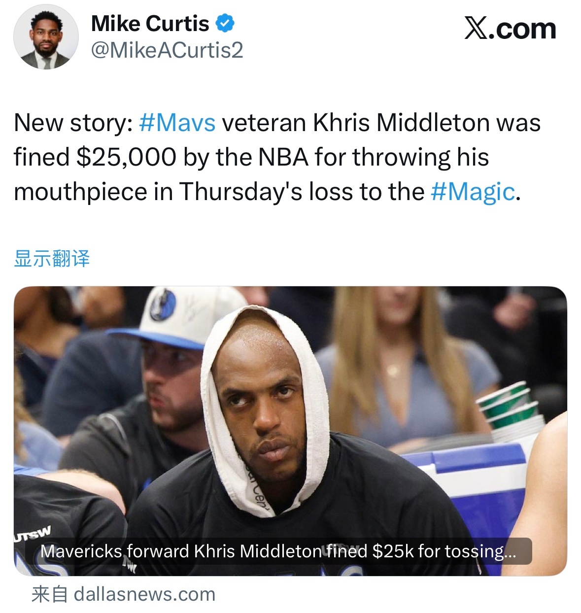 米德尔顿朝观众席扔牙套,罚款2.5万美元。