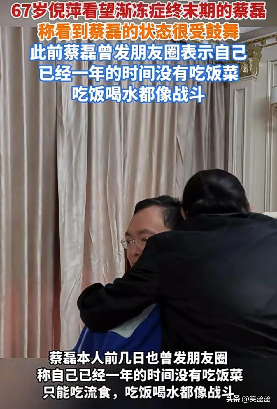 67岁倪萍看望渐冻症终末期的蔡磊,称看到蔡磊的状态很受鼓舞,此前蔡磊曾发朋友圈表示自己已经一年的时间没有吃饭菜,吃饭喝水都像战斗,希望奇迹出现,祝蔡总早日康复!