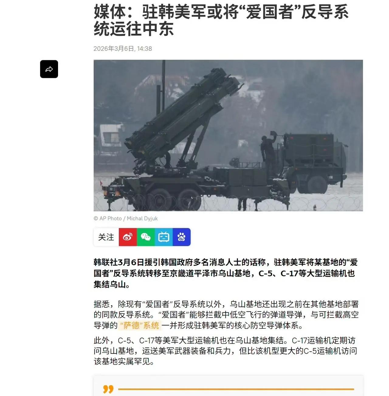 2026年3月初,驻韩美军在乌山空军基地集中收拢爱国者防空反导系统,多架C-5、C-17大型运输机密集停靠。这一系列异动与中东战事直接相关,美军正从亚太抽调装备驰援中东战场。 普通民众能直观感受到,国际局势的变化正以具体的军事调动呈现在眼前。韩国乌山基地的异常动作,不是常规训练,也不是例行部署调整。多套爱国者系统从半岛各处阵地集中转运,大型战略运输机频繁起降,现场画面传递出紧迫的行动信号。这样的场景在驻韩美军部署史上并不多见,只有应对高强度战场消耗时才会出现。中东方向的冲突持续升级,伊朗以导弹与无人机发起持续反击,美军在当地的防空拦截体系承受极限压力。公开信息显示,多套萨德、爱国者系统在实战中损毁,拦截弹库存快速见底,按现有消耗速度难以维持长期作战。军工产能跟不上实战消耗,本土与欧洲方向的兵力与装备难以快速抽调,驻韩美军的现成装备成为最便捷的补充来源。2025年中期,美军已从驻韩部队调走过爱国者系统与相关人员支援中东,时隔不到一年再次启动同类调动,说明中东战场的资源缺口持续扩大。 普通人关注这类信息,核心是想知道远方的战事如何影响身边的安全格局。驻韩美军的反导与远程打击装备,长期承担东北亚区域的威慑与防御任务。爱国者系统与萨德系统构成高低搭配的防空网,守护半岛及周边空域安全。陆军战术导弹、海马斯火箭炮等装备,构成前沿快速打击能力。这些核心装备被抽走,直接降低区域防御密度,让相关国家的民众产生直观的安全焦虑。韩国社会对美军异动反应强烈,媒体持续跟踪报道,政府与美方保持密切沟通,民众对本土防御真空的担忧不断上升。美军的行动以自身战略优先为导向,盟友的安全诉求被放在次要位置。普通民众能清晰看到,军事同盟关系在核心利益面前的现实性。全球军事资源的有限性,在两场区域压力下被充分暴露。美军试图同时兼顾中东与印太两个战略方向,最终只能通过跨区抽调维持战场运转。普通民众不必深究复杂的战略术语,只需看清一个事实,远方的战火正在拉动全球军事布局的调整,每个区域的防御状态都会随之发生改变。 这场跨区域调动清晰呈现美军的全球兵力调配逻辑。地区安全格局会因关键装备的转移出现短期波动。