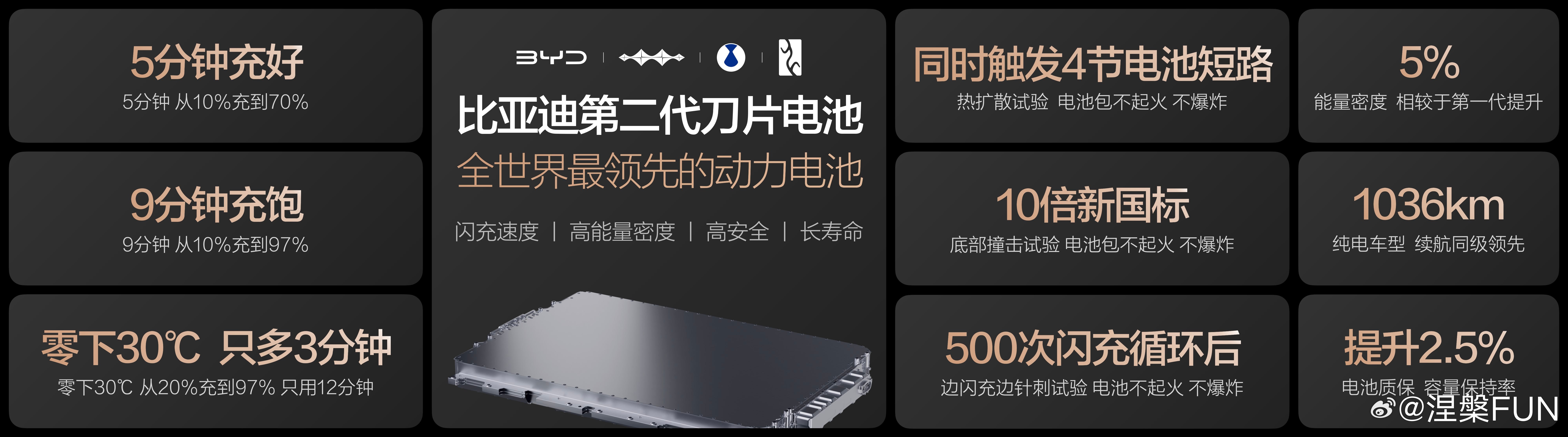 比亚迪第二代刀片电池凭硬核技术实现闪充、续航、安全、寿命的全维度突破,全链路离子闪通、高通量电极重构等核心技术,让它在实现 5 分钟充至 70%、9 分钟充至 97%,零下 30 度仅多 3 分钟闪充的同时,能量密度较第一代提升 5% 以上,腾势 Z9GT 续航更是达 1036 公里。更难得的是,它通过远超新国标的安全试验,电芯终身保修且容量保持率提升 2.5%,还不挑桩、兼容现有公共充电桩,并承诺年底建设20000个闪充站,成为硬核闪充技术树立行业新标杆。