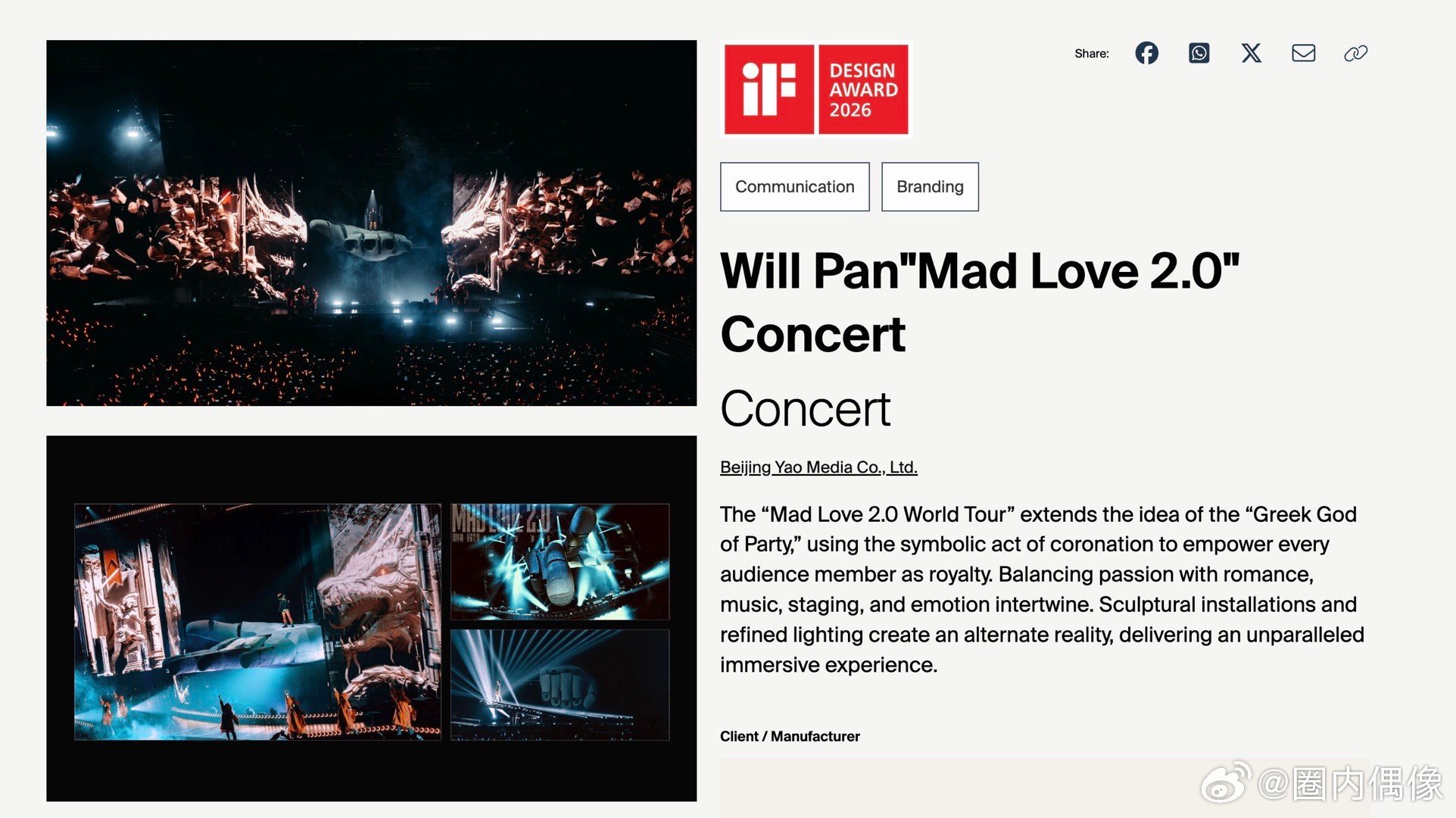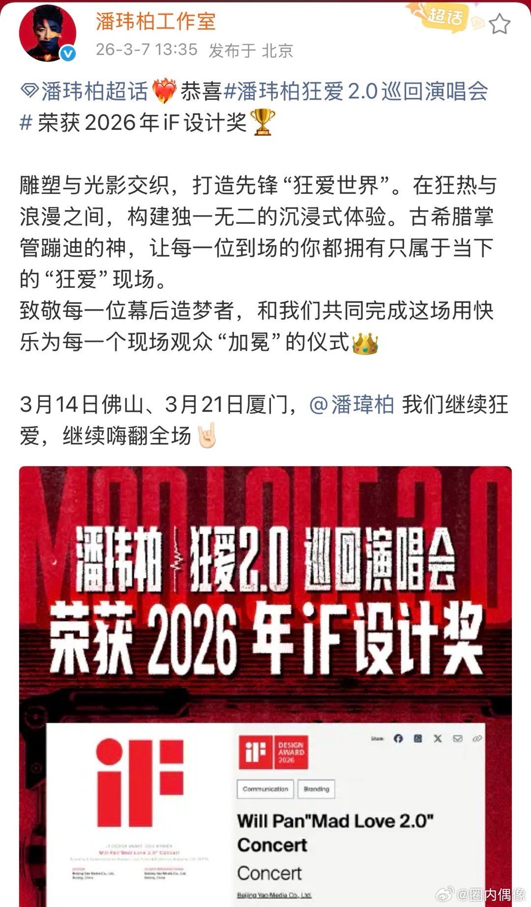 潘玮柏舞台这次真的夯爆了国际认证!潘玮柏狂爱2.0巡演斩获2026德国iF设计奖巨型战神之手、雕塑光影、古希腊蹦迪神坛,打造国际级先锋艺术现场。视听双炸质感拉满,佛山、厦门收官在即,最后两场美学盛宴别错过!