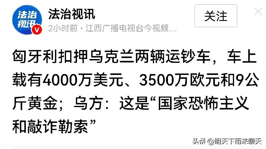 山不转水转,这次乌克兰有求于匈牙利了? 这笔巨额资金估计一时半会到不了乌克兰了,至少也得等到把“友谊”管道修通了吧,乌克兰通过这条管道可把匈牙利拿捏得一愣一愣的。 也搞不懂乌克兰为什么要跨境运现金及黄金,通过银行转账不行吗?还搞这原始的武装押运,这不是自己把脖子伸过去被人牢牢卡住吗?