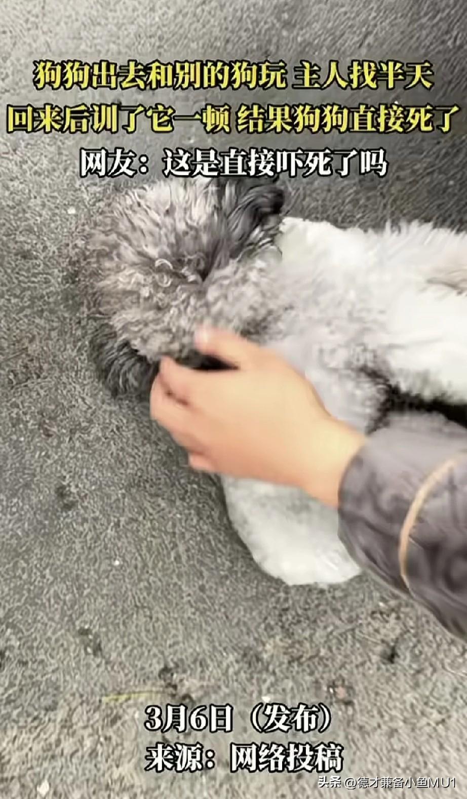 女子家中养的可爱小狗,自己偷偷跑出去和别家狗狗玩耍。女子找了许久才把它找到,回家后训了它一顿,结果狗狗直接僵直,没了呼吸,吓坏女子不知道如何是好了。 或许狗狗觉得,在外面被别的狗欺负,回来又遭家人训斥,这日子实在没法过了,还不如“一了百了”。 狗狗在被主人大声呵斥、追赶、肢体冲突等“教育”后,会立即倒地、无法唤醒,且没有呼吸和心跳,这极有可能是因“极度应激”诱发急性心力衰竭、休克或其他严重生理反应而导致猝死。 网友说:遇到这种情况要做人工呼吸。狗狗浑身僵硬时,马上用手掰开狗狗的嘴巴,往它口中用力吹气,至少吹一分钟多,使劲吹,之后你会听见狗狗肚子里有咕噜咕噜的声音,它会慢慢恢复呼吸,然后要马上送去宠物医院继续抢救。
