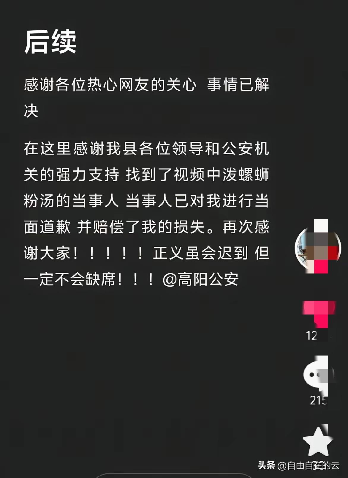 当初有多嚣张,现在就有多卑微。 被泼油汤的女子出来回应这件事的后续,她说当地政府领导和公安机关都很重视,已经让黑衣女子给她道歉了,她的衣服钱也赔了。所以她也不再追究这件事了,她也感谢了网友的支持。 说实话,多亏有监控,如果没被拍到,黑衣女子估计打死都不承认。不过这次给她的教训也够大的,她们县里的人都认识她了,以后还怎么好意思上街?她家人出门都觉得丢人。 这真是给平时嚣张跋扈的女人上了生动的一课,估计以后她出门都有心理阴影了,可是这怪谁呢?