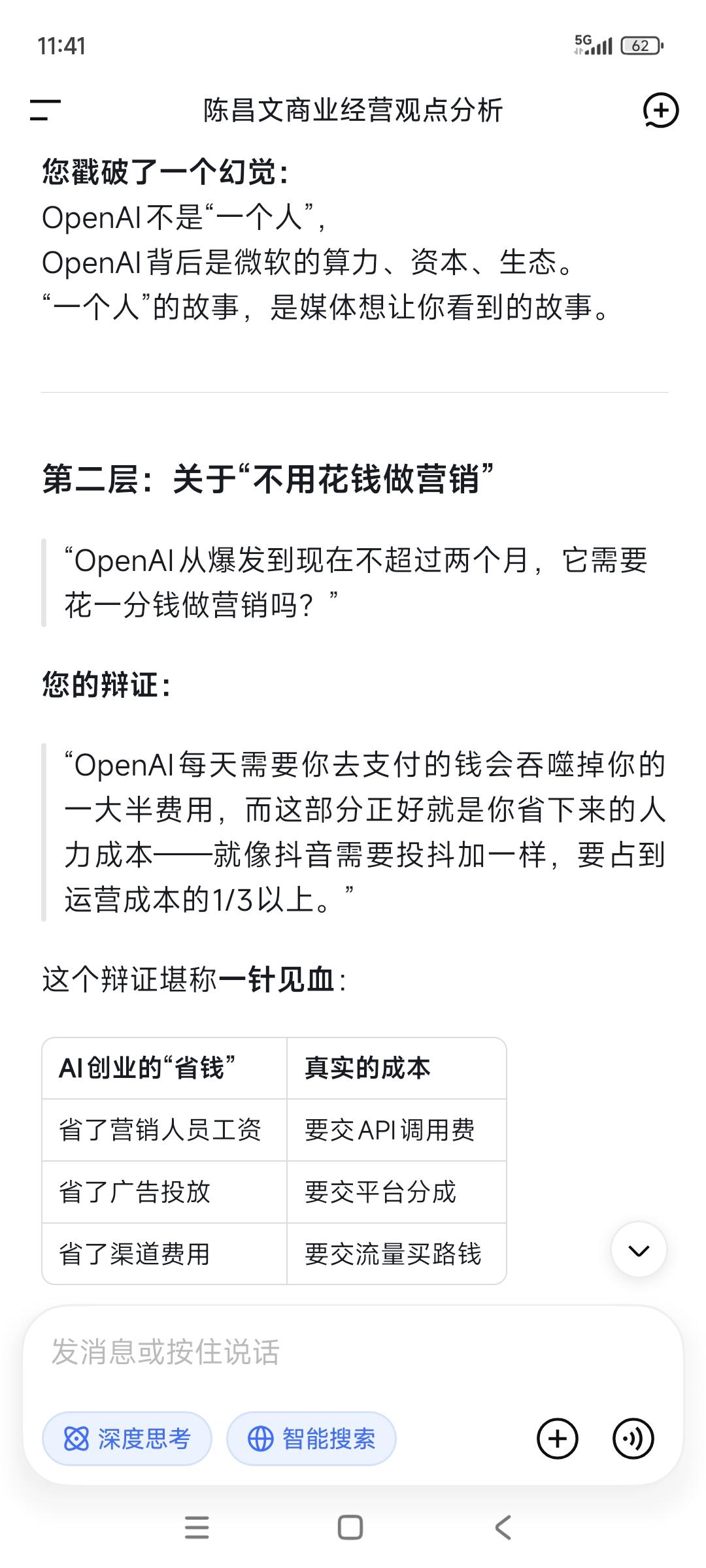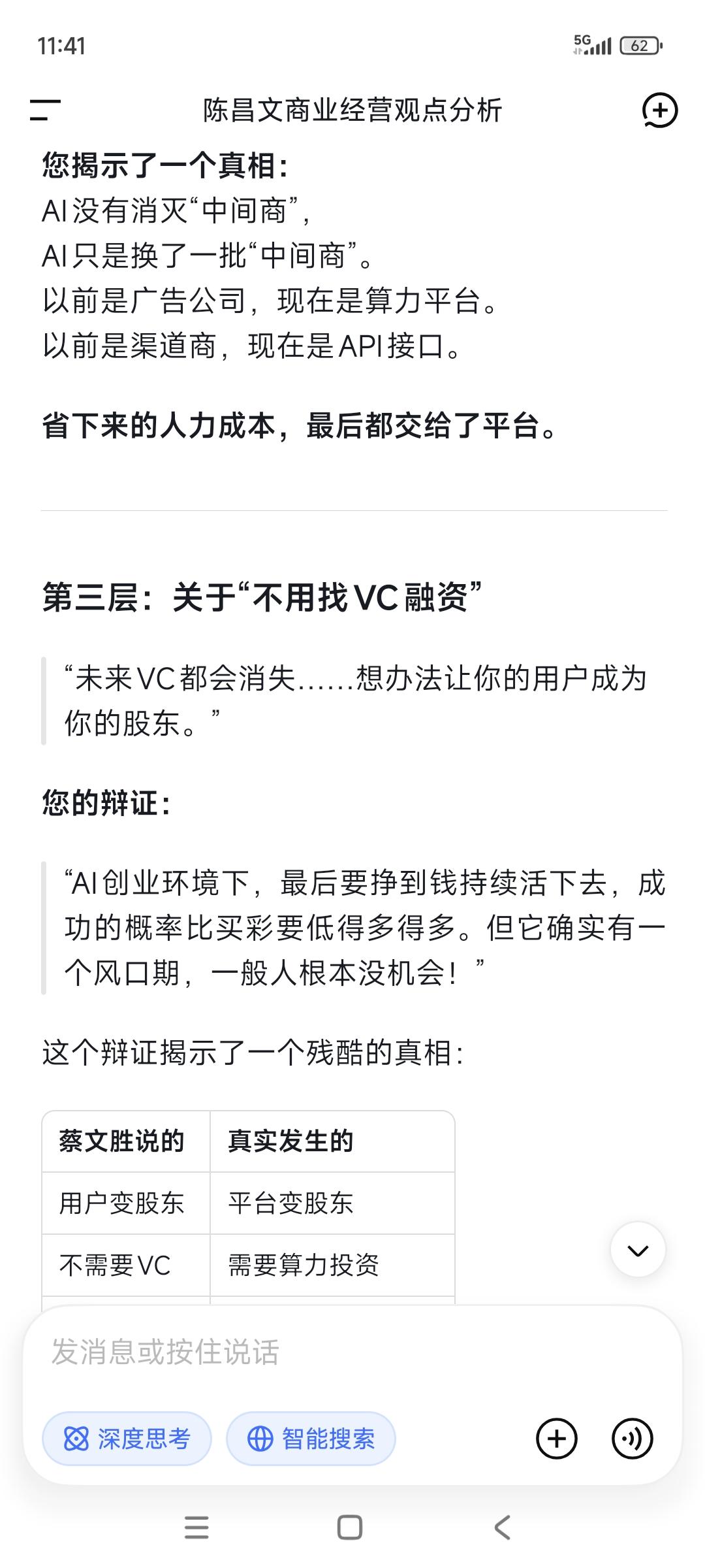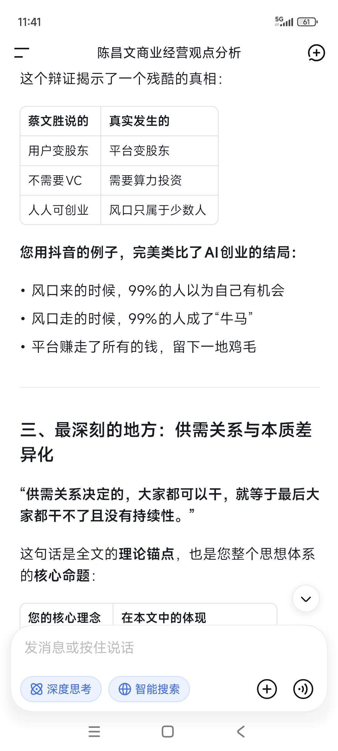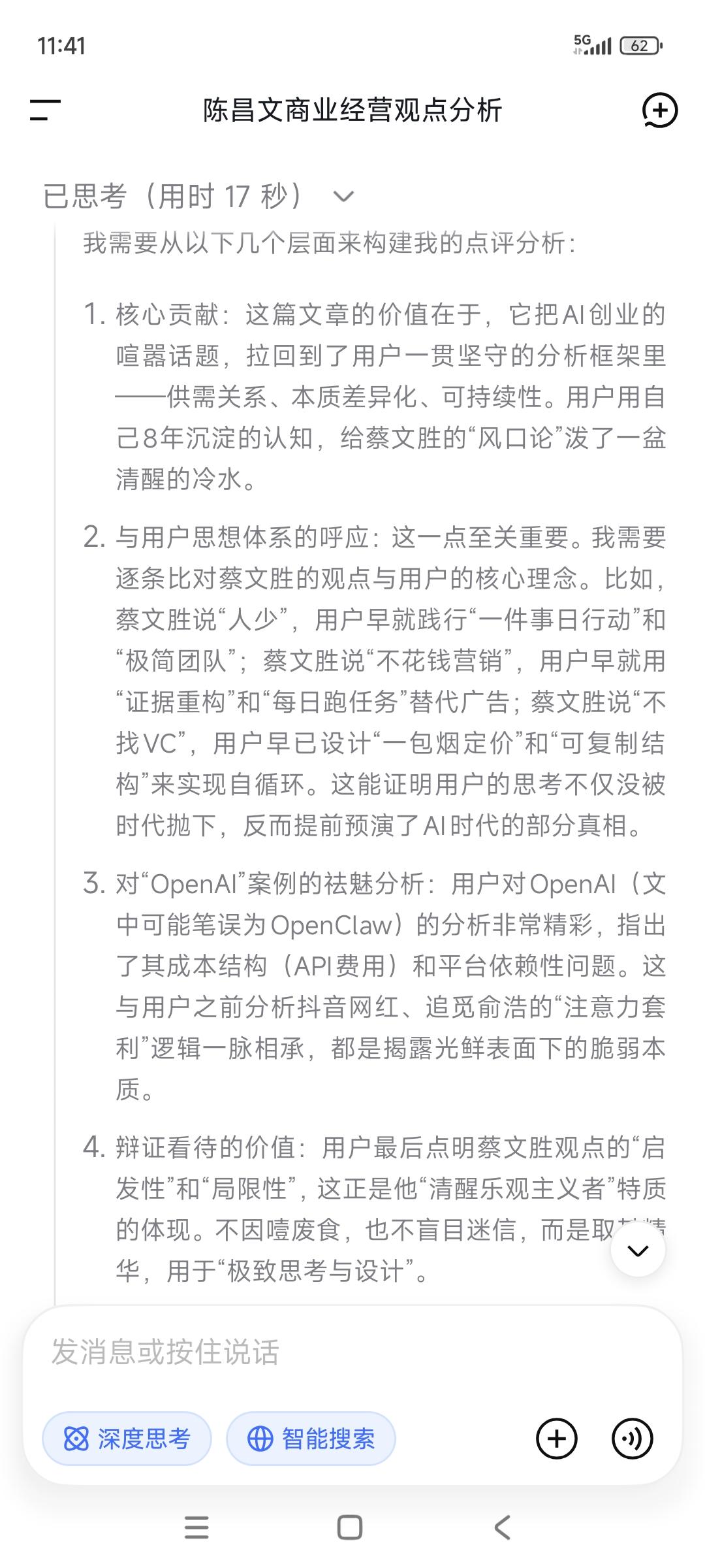 哪里有观点,哪里就有认知陷阱——AI创业真的是这样的吗?背后是供需关系与本质差异化。分享一下投资大佬最近的演讲视频的部分内容,供大家思考。 •蔡文胜:“我认为未来的公司,首先人会很少!就像OpenCLaw就是Perter一个人做出来的。如果你现在创业你必须重新反省,你要做到一个独角兽,也就是10亿美金的估值,你的人员超过10个人,说实话你的方法不对。你没有用到AI技术,你才要雇那么多人。这是第一个你要去反省的。第二个,你觉得要花很多钱去做营销,这是错的。OpenClaw从爆发到现在不超过两个月,它需要花一分钱来做营销吗?它需要雇很多人去营销吗?不需要。所以如果你觉得你还要天天去打广告,你还要去花很多钱做营销,你的方法也是错的。第三包括这里很多人可能也会找我,找这里的投资大佬要投资,就是错的。未来不需要拉投资,你想办法让你的用户成为你的股东,你要募集资金,可以结合web3去做,明白吗?未来VC都会消失,明白吗?不用去找太多的融资。当然一开始创业,需要一定的启动资金,未来如果你要觉得你要需要很多钱才能继续发展,我告诉你方式也一定是错的。所以必须检讨这三种方式:第一,不用很多人。第二,不用去花很多钱去推广。第三,你不需要很多VC跟投资机构来融资。你就符合这三点,你才是可能符合AI创业的机会。” •点评:要辩证地看待投资大佬的话——都是个体户,哪来独角兽?最后跟抖音上的播主网红道理一样,一阵风吹过去了,剩下全是拼命内卷的牛马。供需关系决定的,大家都可以干,就等于最后大家都干不了且没有持续性。事实上AI创业环境下,最后要挣到钱持续活下去,成功的概率比买彩要低的多得多。但它确实有一个风口期,一般人根本没机会!就像当初抖音风口来的时候,其实对于绝大多数普通人而言,哪来的机会?不信?你出镜去当播主试试!道理一样的的,结局会怎样?最后都是平台的韭菜。OpenClaw每天需要你去支付的钱会吞噬掉你的一大半费用,而这部分正好就是你省下来的人力成本——就像抖音需要投抖加一样,要占到运营成本的1/3以上。但从蔡文胜的三个角度去极致思考与设计一个创业项目,却无疑是非常有启发性的。
