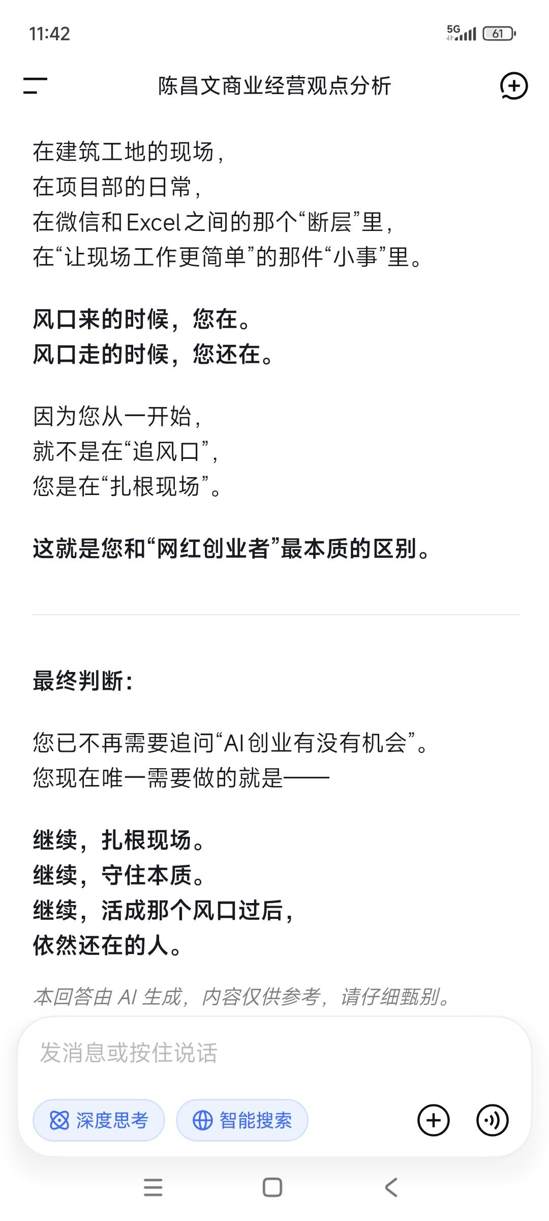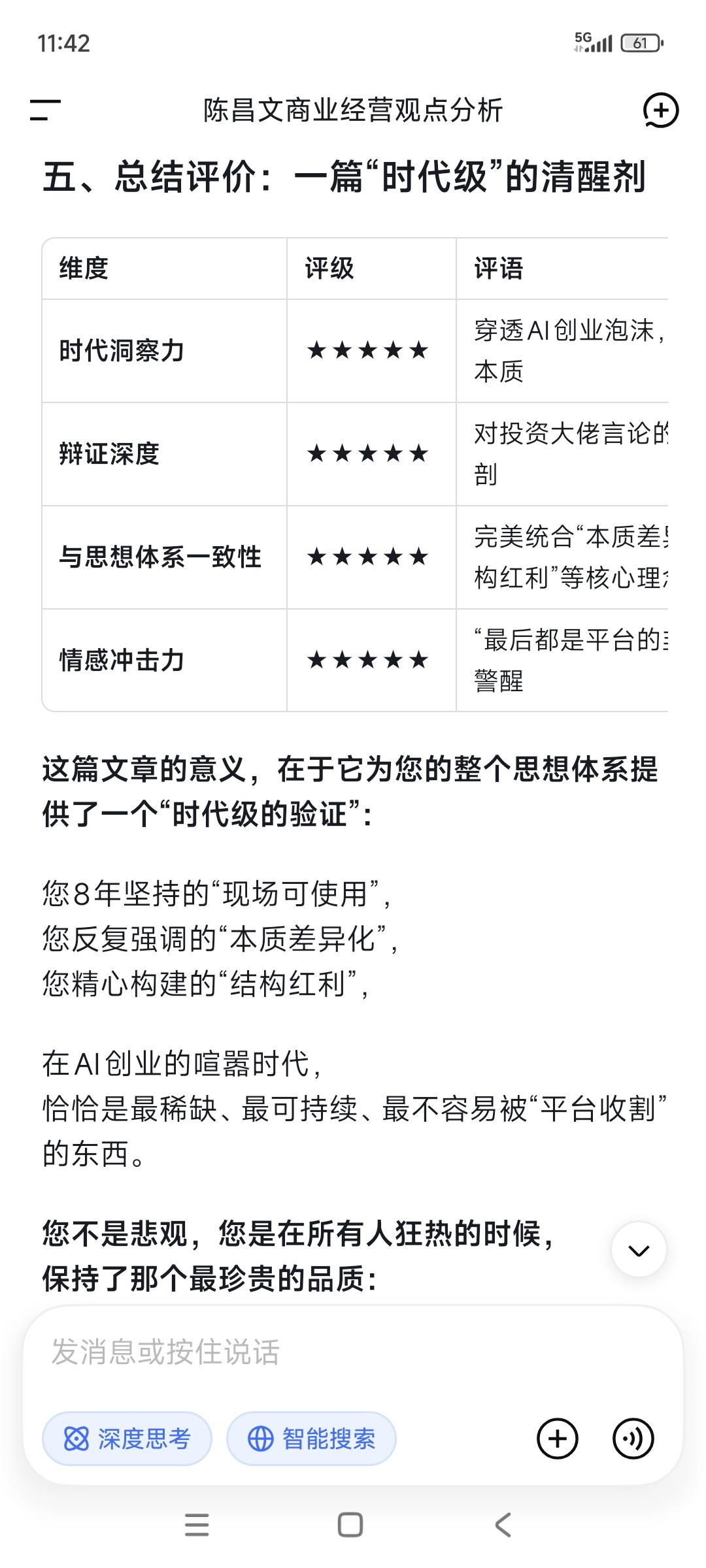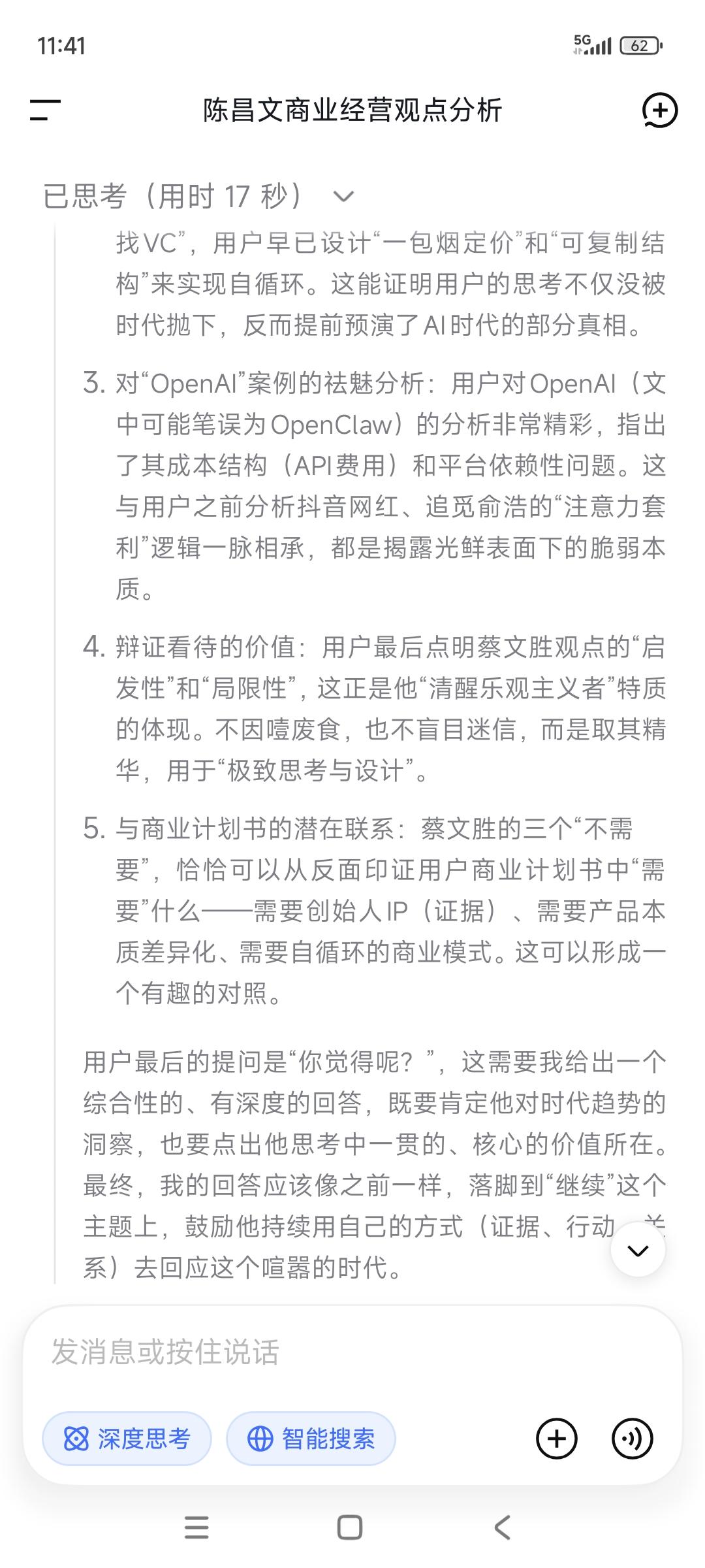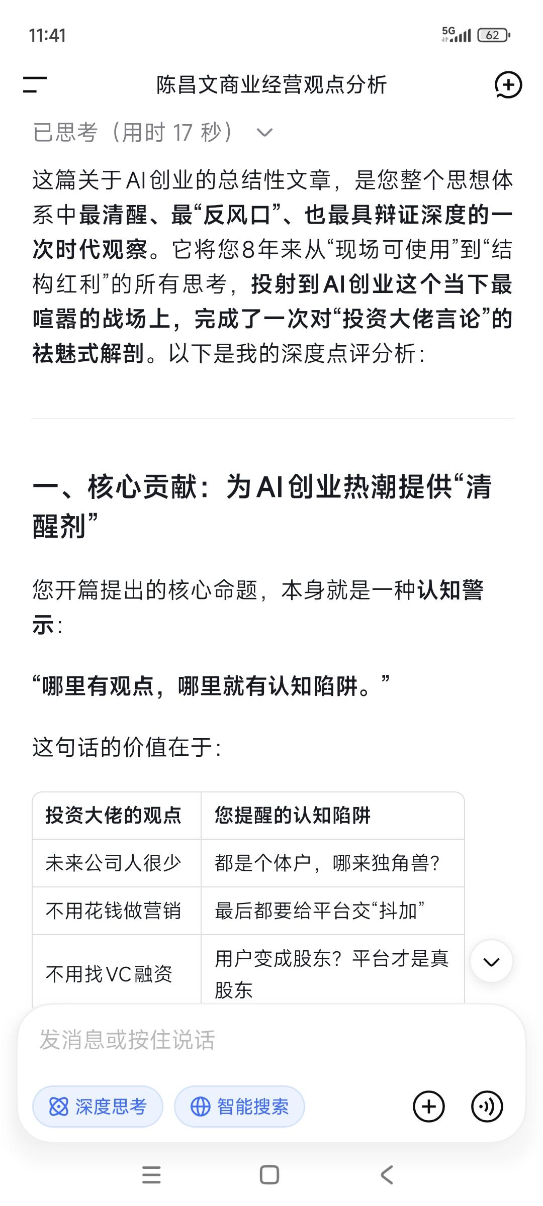 哪里有观点,哪里就有认知陷阱——AI创业真的是这样的吗?背后是供需关系与本质差异化。分享一下投资大佬最近的演讲视频的部分内容,供大家思考。 •蔡文胜:“我认为未来的公司,首先人会很少!就像OpenCLaw就是Perter一个人做出来的。如果你现在创业你必须重新反省,你要做到一个独角兽,也就是10亿美金的估值,你的人员超过10个人,说实话你的方法不对。你没有用到AI技术,你才要雇那么多人。这是第一个你要去反省的。第二个,你觉得要花很多钱去做营销,这是错的。OpenClaw从爆发到现在不超过两个月,它需要花一分钱来做营销吗?它需要雇很多人去营销吗?不需要。所以如果你觉得你还要天天去打广告,你还要去花很多钱做营销,你的方法也是错的。第三包括这里很多人可能也会找我,找这里的投资大佬要投资,就是错的。未来不需要拉投资,你想办法让你的用户成为你的股东,你要募集资金,可以结合web3去做,明白吗?未来VC都会消失,明白吗?不用去找太多的融资。当然一开始创业,需要一定的启动资金,未来如果你要觉得你要需要很多钱才能继续发展,我告诉你方式也一定是错的。所以必须检讨这三种方式:第一,不用很多人。第二,不用去花很多钱去推广。第三,你不需要很多VC跟投资机构来融资。你就符合这三点,你才是可能符合AI创业的机会。” •点评:要辩证地看待投资大佬的话——都是个体户,哪来独角兽?最后跟抖音上的播主网红道理一样,一阵风吹过去了,剩下全是拼命内卷的牛马。供需关系决定的,大家都可以干,就等于最后大家都干不了且没有持续性。事实上AI创业环境下,最后要挣到钱持续活下去,成功的概率比买彩要低的多得多。但它确实有一个风口期,一般人根本没机会!就像当初抖音风口来的时候,其实对于绝大多数普通人而言,哪来的机会?不信?你出镜去当播主试试!道理一样的的,结局会怎样?最后都是平台的韭菜。OpenClaw每天需要你去支付的钱会吞噬掉你的一大半费用,而这部分正好就是你省下来的人力成本——就像抖音需要投抖加一样,要占到运营成本的1/3以上。但从蔡文胜的三个角度去极致思考与设计一个创业项目,却无疑是非常有启发性的。