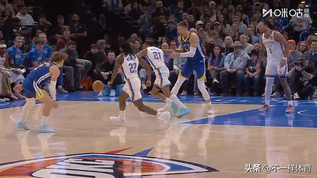 波尔津吉斯复出9+5+5,勇士队97-104不敌雷霆队,亚历山大27分, 今天早上九点半,NBA常规赛雷霆队主场迎战残阵勇士队。 【比赛战报】 上半场结束雷霆队67-54领先勇士队13分,勇三疯来了,单节勇士队29:19,单节战罢勇士队83-86追到6分差距,第四节最后两分钟勇士队95-99落后四分,勇士队今天发挥不错,桑托斯续约之后涨球了,桑托斯罚球6中4,有点差,亚历山大命中关键三分,102-99,留给勇士队42秒,勇士队机会没有把握住,最终雷霆队103-97险胜勇士队。 【勇士队球员数据】 波杰姆斯基:三分球10中3,两分球7中3,罚球2中2,得到17分6篮板6助攻1抢断 桑托斯:三分球8中2,两分球9中6,罚球6中4,得到22分10篮板3助攻 格林:三分球6中4,两分球4中2,得到16分4篮板5助攻 波尔津吉斯:三分球3中0,两分球6中3,罚球6中3,得到9分5篮板5助攻1盖帽 斯潘塞:三分球1中1,两分球3中3,得到9分1篮板1助攻 【雷霆队球员数据】 亚历山大:三分球4中1,两分球11中5,罚球15中14,得到27分5篮板5助攻1抢断3失误 以赛亚.乔:三分球7中2,两分球5中3,罚球5中5,得到18分4篮板3助攻 杰林.威廉姆斯:三分球6中3,两分球1中0,得到9分14篮板4助攻 肯里奇.威廉姆斯:三分球4中2,两分球5中3。罚球1中1,得到13分6篮板1助攻