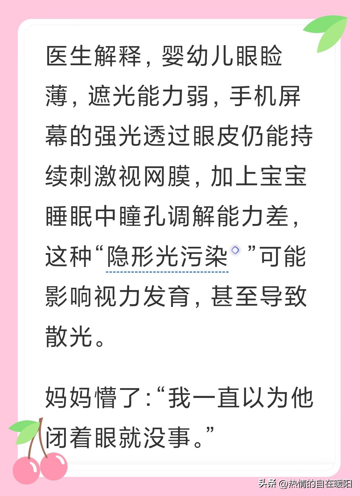 家长少刷一分钟手机 宝宝多一分清晰未来 别以为宝宝闭眼就“百毒不侵” 黑暗是婴幼儿视力发育的保护色 刚看到一则腾讯新闻 河南一位妈妈 常在6个月宝宝睡着后床边刷手机 以为闭眼没事 结果宝宝查出散光,排除遗传因素 医生解释核心 婴幼儿眼部结构特殊 眼睑薄,遮光仅成人40% 强光透过眼皮刺激视网膜 睡眠中瞳孔无法调节 睡着时放大且无调节力 光刺激干扰眼球发育,诱发散光 蓝光双重伤害 损伤视网膜感光细胞 抑制褪黑素分泌, 影响睡眠与激素释放 如今家长老人闲暇爱抱手机 家有宝宝 我赶紧让豆包整理 0 - 3岁护眼避坑清单 [福]0 - 3岁宝宝护眼提醒[福] 1、睡眠时:给“真正的黑暗”[微风] 宝宝睡着后 不在床边玩手机/开亮灯 夜灯选暖红光,亮度<3 lux, 放墙角 窗帘选遮光款,挡窗外灯光 2、日常:少看屏幕[微风] 生活细节别踩坑 常换睡姿/玩具位置 不用手揉眼,用棉柔巾擦眼周 正午强光不外出 3、必做筛查:别错过黄金期[微风] 6个月:首次眼科筛查 1岁:复查视力发育 3岁:正式检查,建眼健康档案 4、立刻就医信号[微风] 宝宝频繁揉眼、眯眼、歪头、怕光、流泪、眼球抖 马上看眼科 [心]核心:家长少刷一分钟手机 宝宝多一分清晰未来 (图片来自网络截图) 手机对儿童危害 手机对娃影响 儿童护眼技巧 孩子护眼攻略 婴幼儿护眼误区