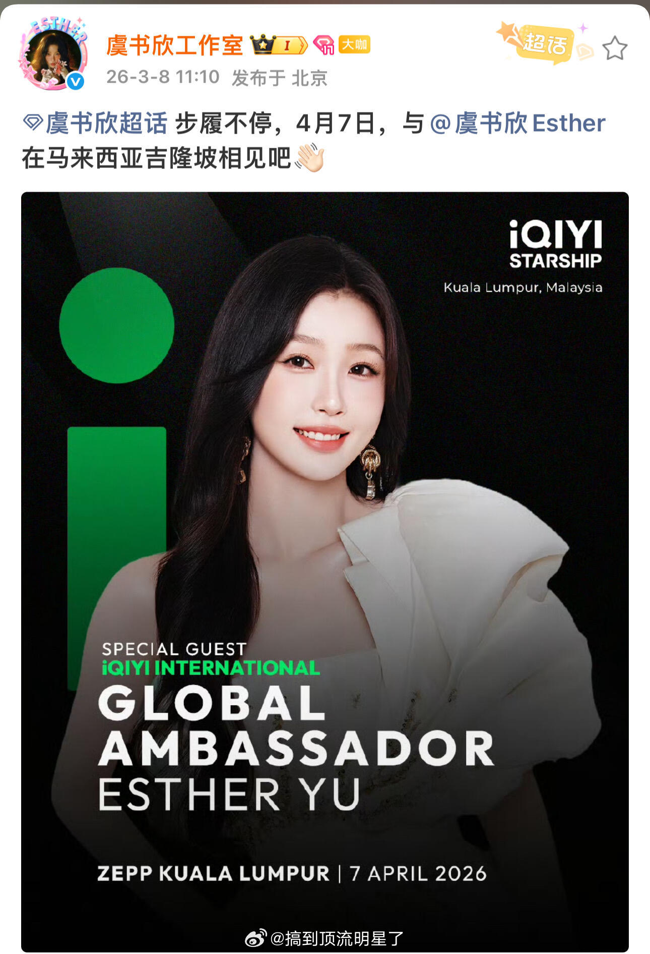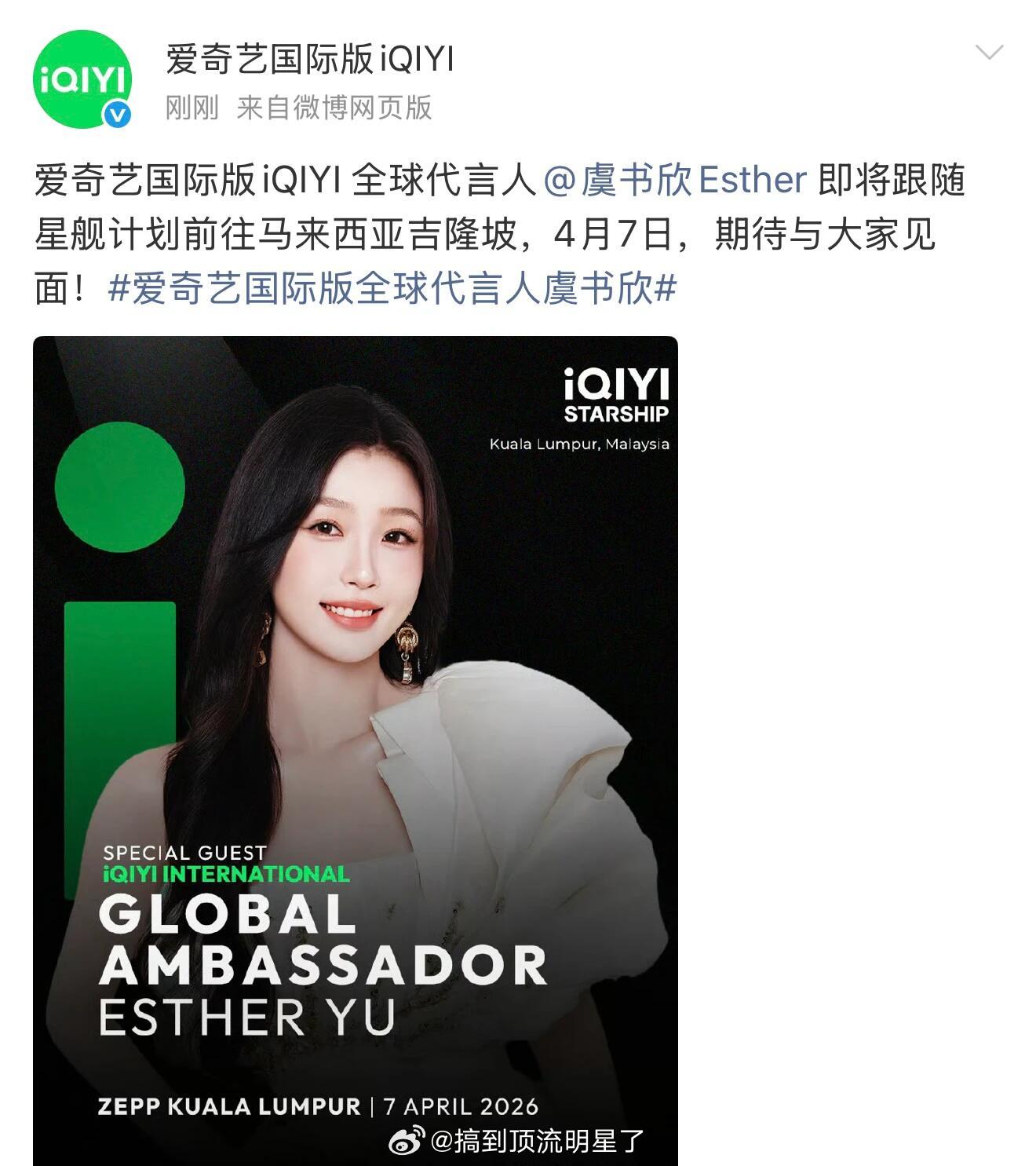 虞书欣将于4月7日参加爱奇艺马来西亚吉隆坡的活动,作为爱奇艺国际版全球代言人,这