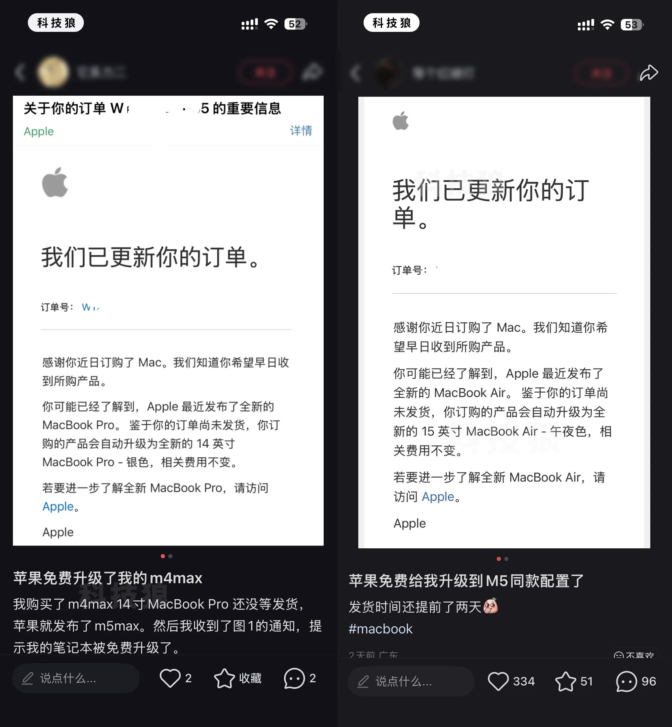 另一位用户o2b的经历更具代表性。他在2月中旬下单48GB内存版M4 Max,原本预计3月初送达,却收到订单变更通知——M5 Max直接替换旧款,且起步存储从1TB升级至2TB。这种"无感升级"甚至无需用户主动申请,苹果通过系统自动完成旧单取消与新单确认,全程静默处理。 这波操作背后,是苹果M5系列采用的全新Fusion融合架构带来的性能红利。该架构将两颗3nm晶粒整合为单片SoC,M5 Max的GPU峰值算力达到M4 Max的4倍以上,AI性能更是暴涨,可本地运行千亿参数大模型。对于专业用户而言,这意味着从8K视频剪辑到3D渲染的全流程提速。