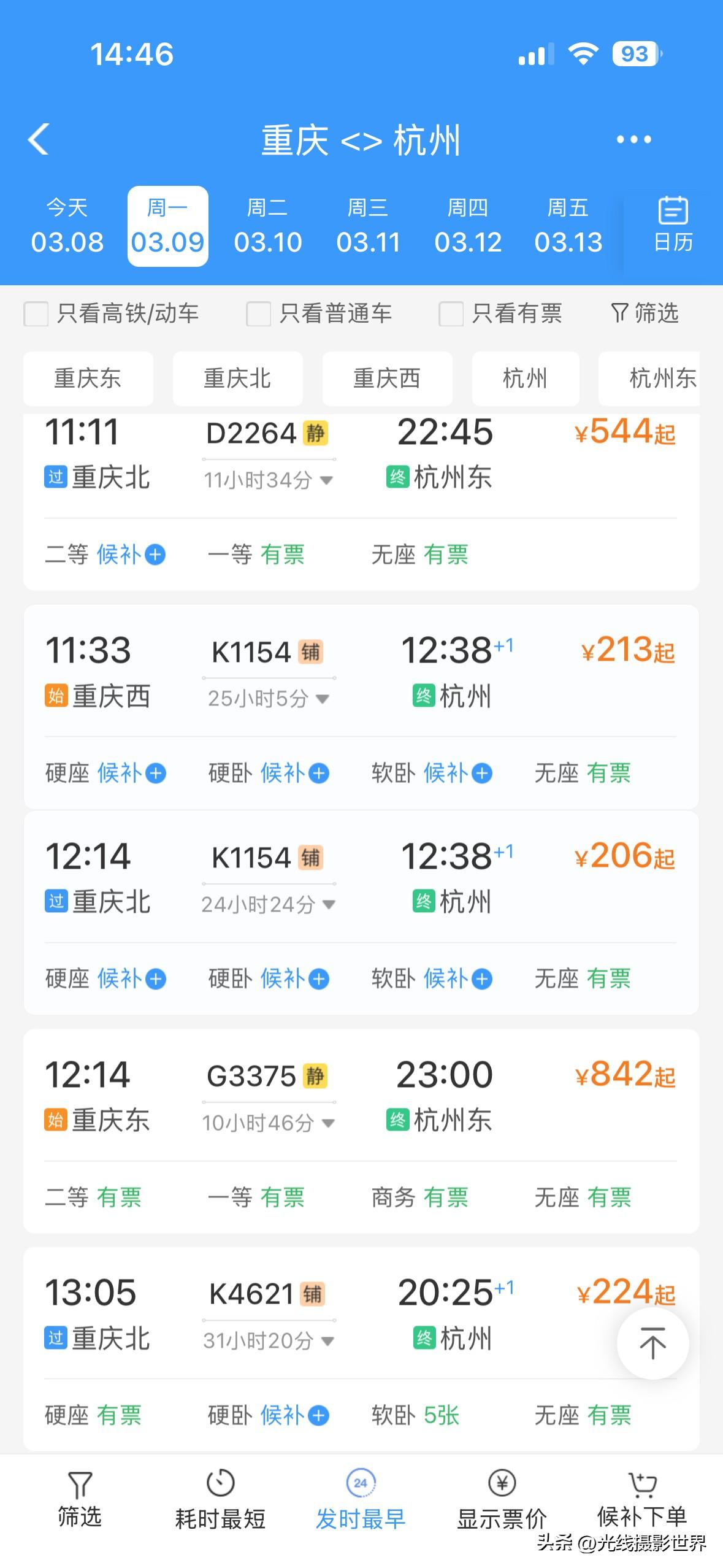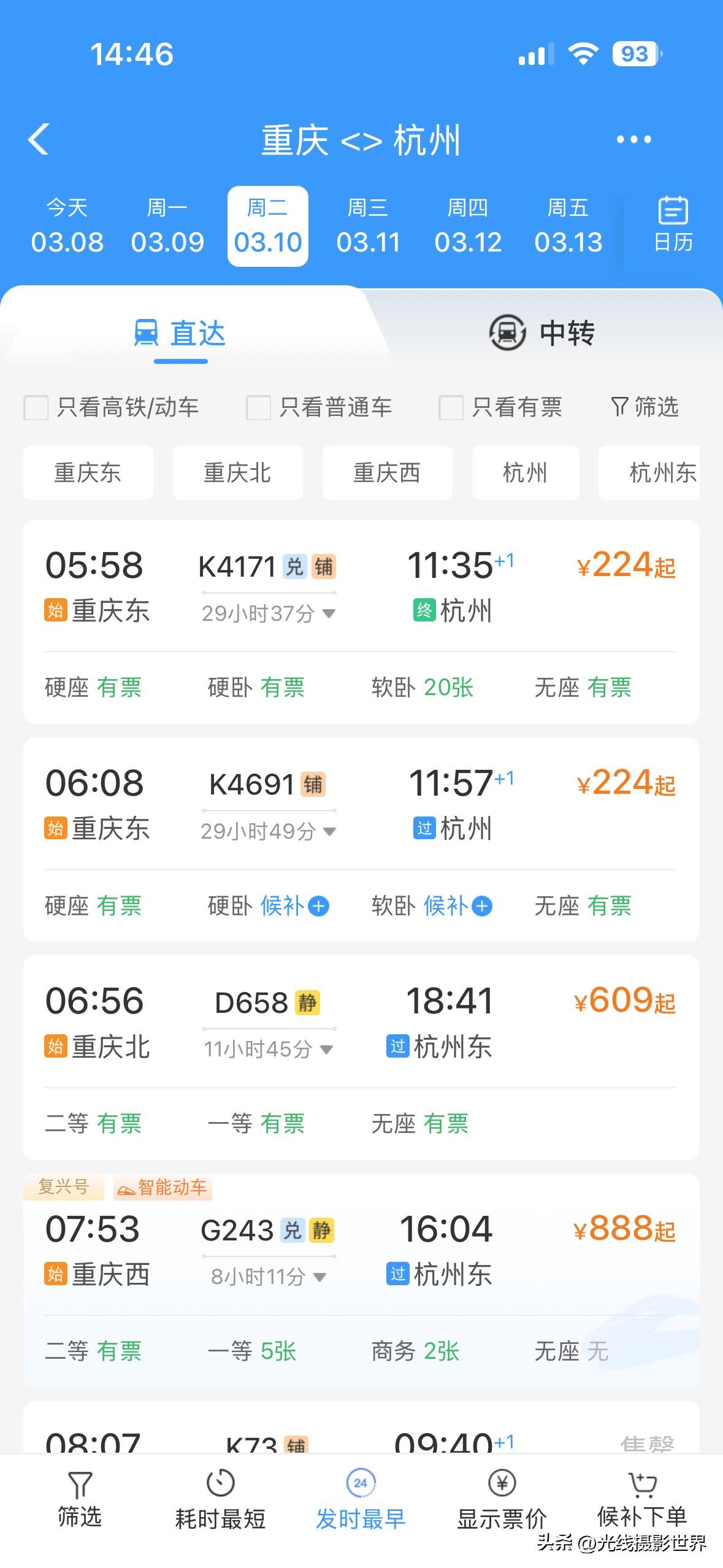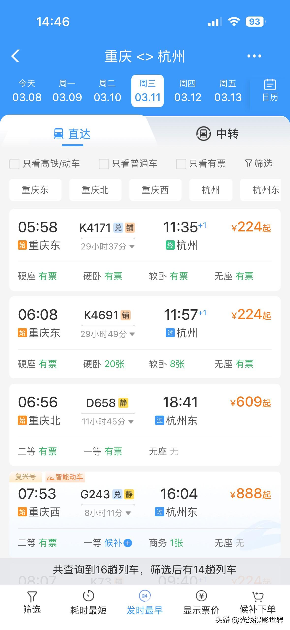 真的是特别奇葩,重庆东站,居然在凌晨5点58分有一趟始发车前往浙江省杭州市……3月8日,我发现,重庆到杭州的火车票,如果是正常时间段的K字头绿皮火车的卧铺,最近一段时间都很抢手,几乎是秒光,一票难求! 但是,3月1日到8日,未来几天……重庆到杭州……这个凌晨5点58分从重庆东站始发的K4171次绿皮火车……就人人嫌弃了……几乎是无人问津的感觉! 坐K字头绿皮火车的人,就是图一个省钱! 可是,凌晨5点58分发车……一大早的,没有地铁,只能打车去重庆东站……打车到重庆东站,动辄50块钱甚至100多块钱啊! 哎,重庆东站,成都铁路局,究竟咋想的呢?! 绿皮火车,非要让不愿意花高价的人掏钱打车…… 好吧,重庆东站,能否把这趟车改为上午8点半或者8点以后发车呢?! 重庆地铁是早上6点半开始运营……重庆主城区这么大……很多地方,即便是赶6点半的第一趟地铁……也要超过1个小时才能抵达重庆东站……再加上安检进站和上车的时间……8点,真的不能再早了! 如果K4171次绿皮火车能够改到上午8点半左右发车,我相信,这趟车一定会非常受欢迎啊!