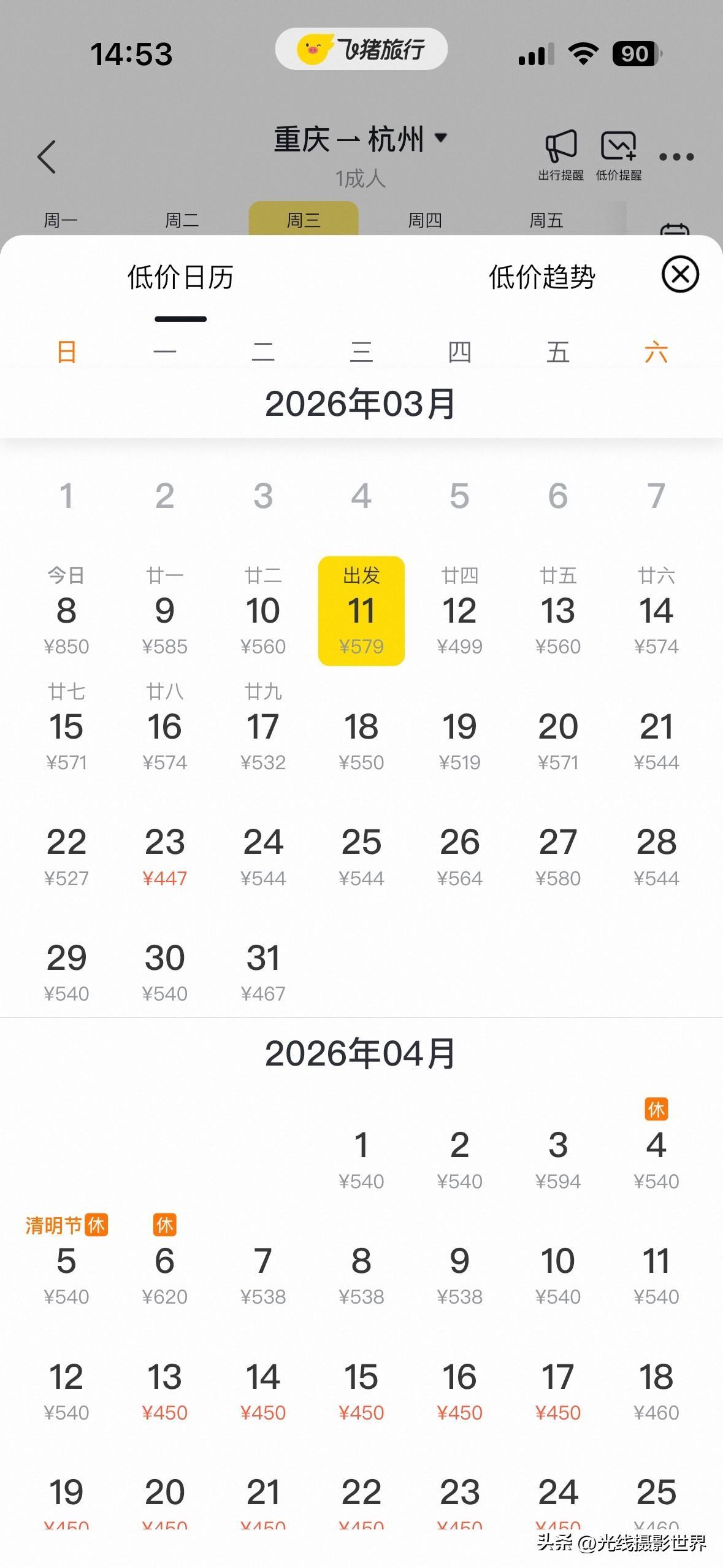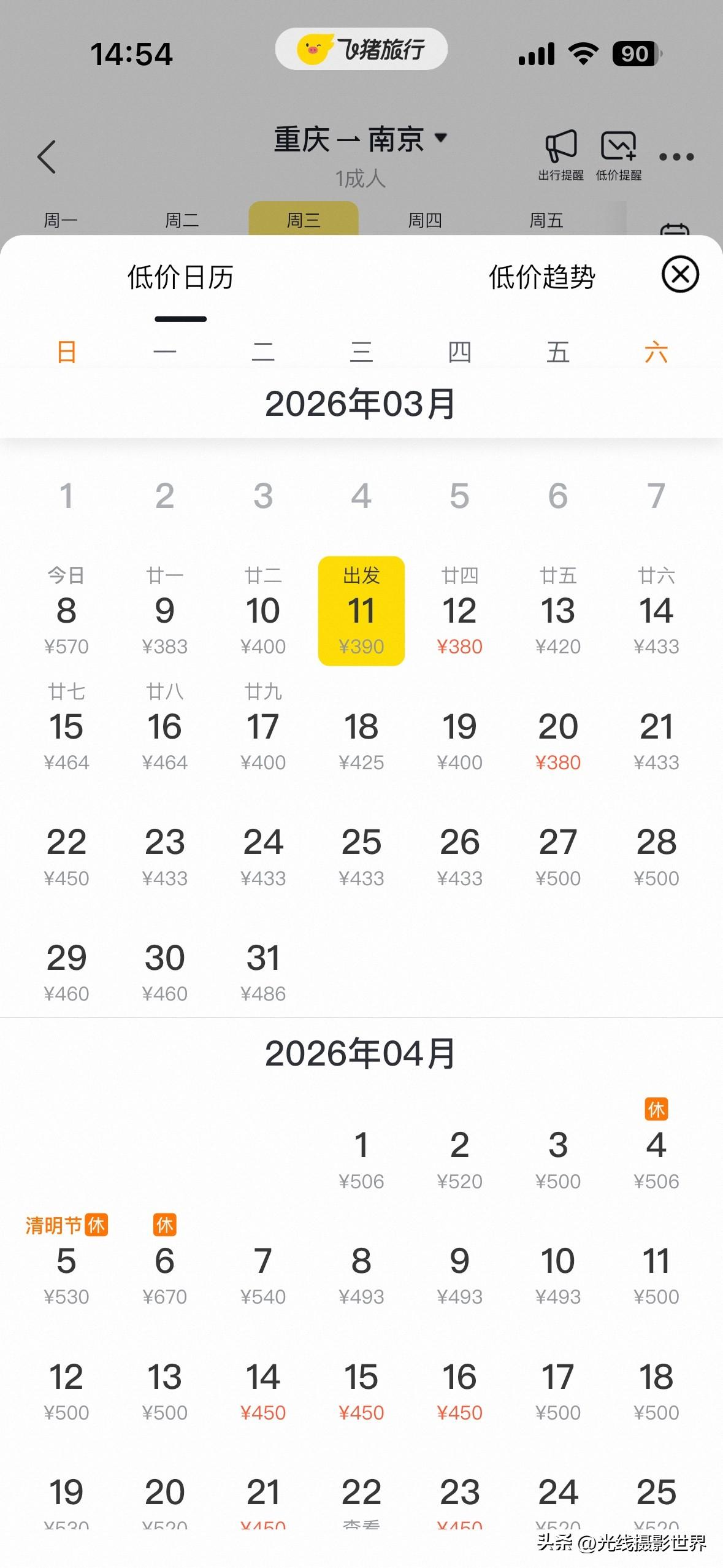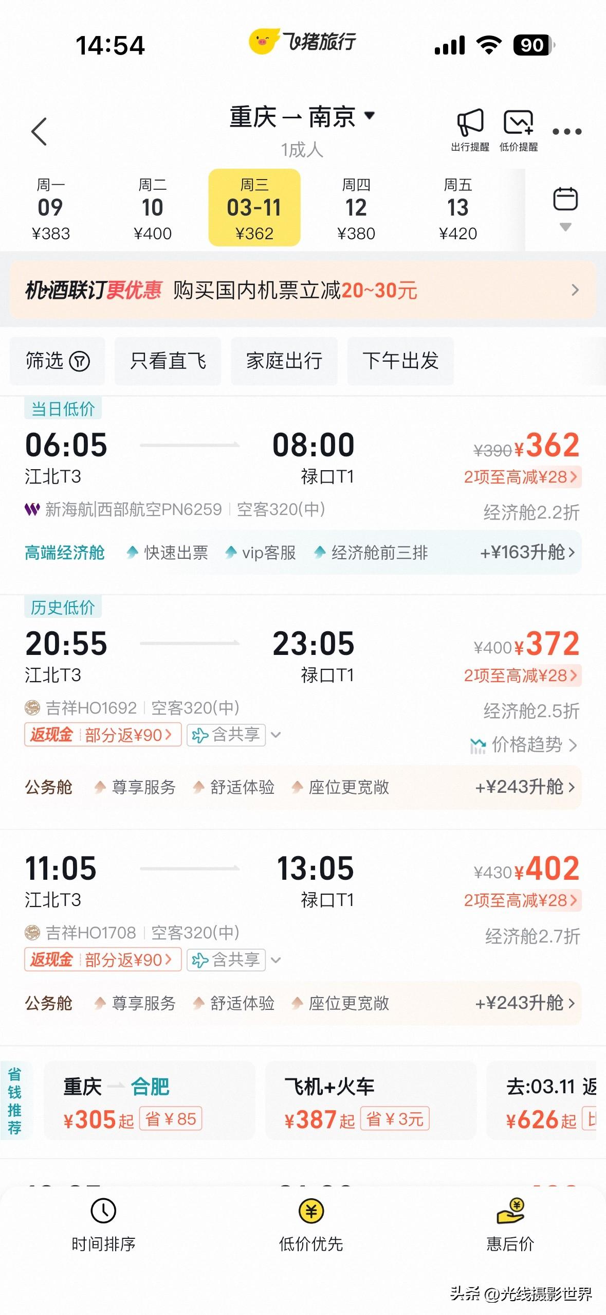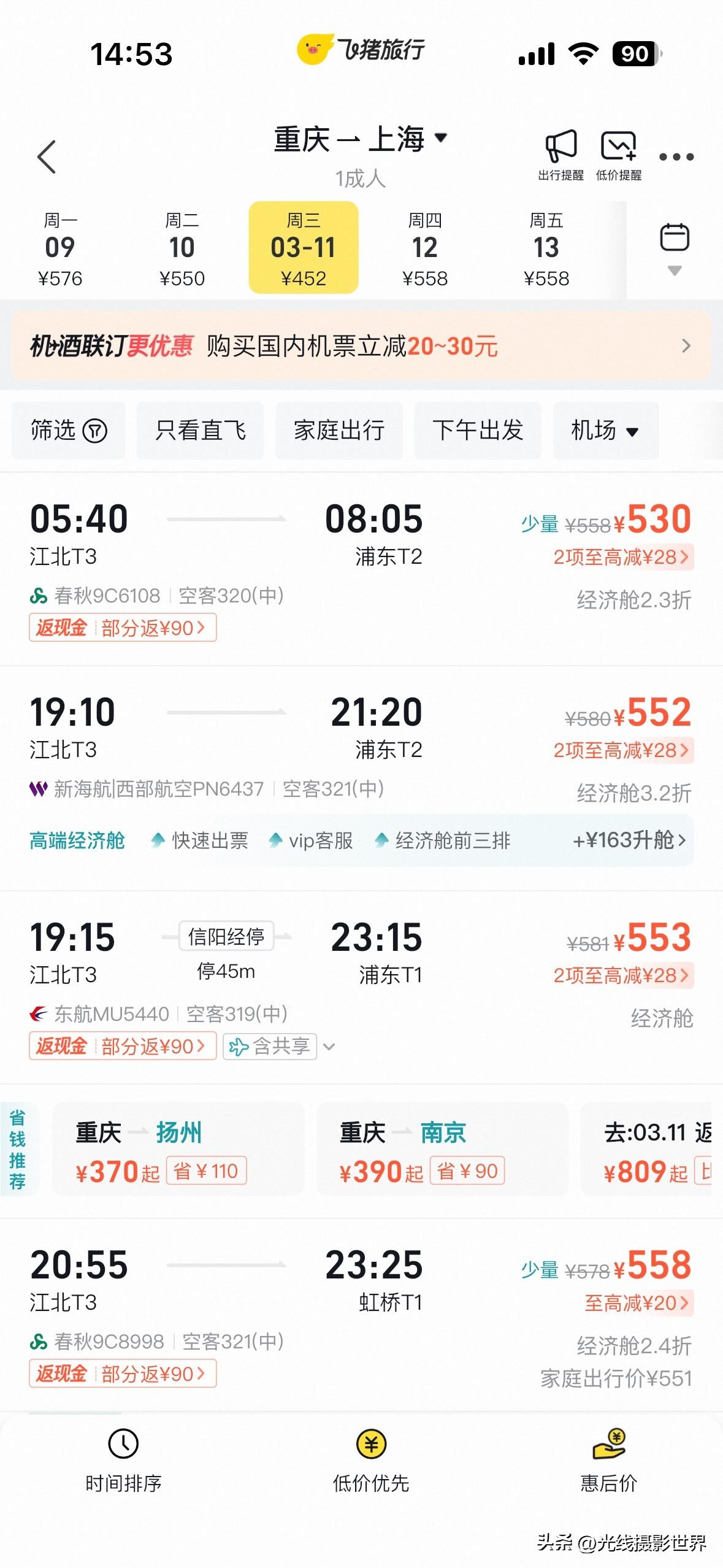 哎!3月8日,我查询了重庆飞杭州、上海、南京的机票,都不便宜啊!按理说,3月8日以后,机票都会白菜价……但是,3月8日到31日,重庆飞长三角的机票,都没有出现白菜价……普遍都要500多块钱左右……曾经,同期的话来说,机票很多都会跌倒300块钱左右,甚至跌到200块钱…… 不得不说,2026年春天,无论是经济活力,还是旅游踏青赏花下江南的魅力……长三角的吸引力可能还是非常巨大吧?! 哎,多么怀恋……250块钱重庆飞杭州、南京……的3月……