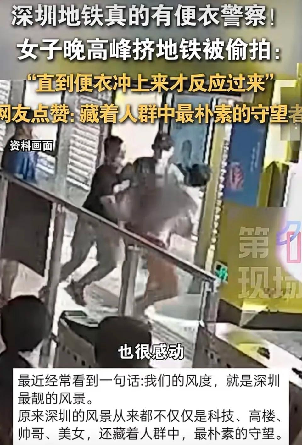 人民的守护者!3月6号晚上下班高峰期,深圳有个姑娘正坐地铁,根本不知道身边发生了啥事。突然旁边蹿起来几个人,一把就把旁边一个男的摁住了,还喊了句“我是地铁便衣,别动”! 这姑娘当时就懵了,缓过神来才明白,原来自己被人偷拍,她还没发觉,便衣警察早就盯上那个男的了,一路跟着取证,瞅准时机就动手抓人 。 后来这姑娘跟着回去做了笔录,那个偷拍的也被拘留了。她回去发了视频,说自己很后怕,要不是便衣一直在暗处盯着,这种人不知道还得干出啥事来。她也说自己是幸运的,也真的很感动。 这事必须要给深圳的“帽子叔叔”点个赞,咱们平时坐地铁,刷手机、发呆、赶路,根本不会想到人群里头藏着这种“隐形守护者”。 他们可能每天就混在早晚高峰的人堆里,穿的跟咱们一样,背着个包,看着平平无奇。但眼睛是一直在扫着的,谁不对劲,谁老往姑娘身边凑,谁拿着手机角度不对,他们的心里清清楚楚,这种安全感真不是盖的。 而这事最戳人的是“你不知道,但有人知道”。你在明处,坏人在暗处,但便衣比坏人藏得还深。 这种守护是真的在拿时间跟你耗,地铁一趟一趟坐,人群一趟一趟跟,就为了等那一下,把你护住了。