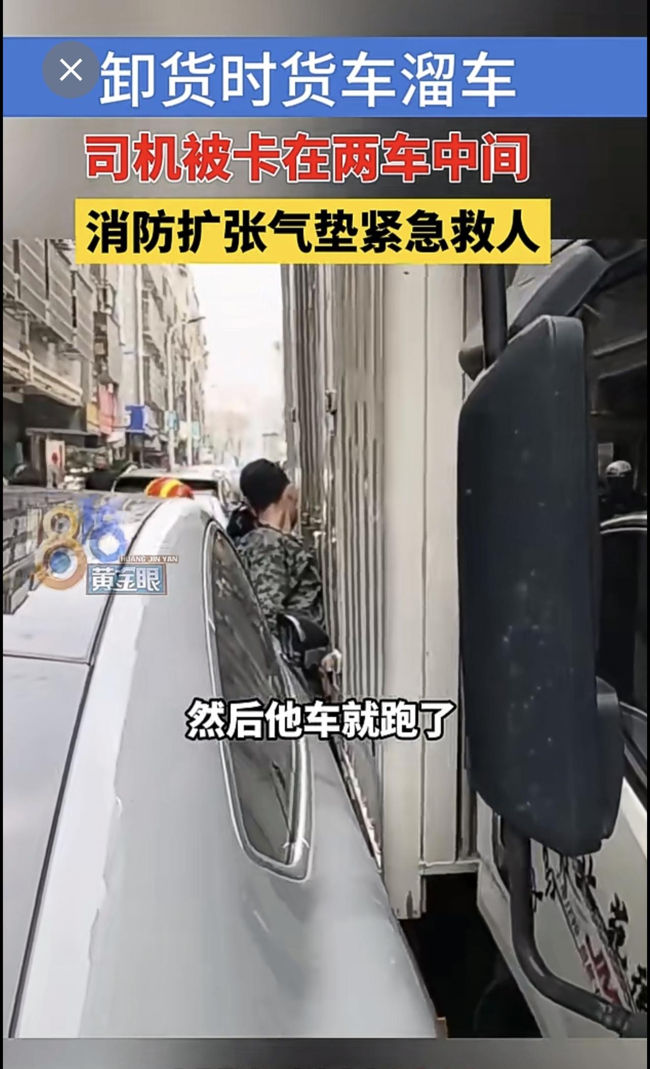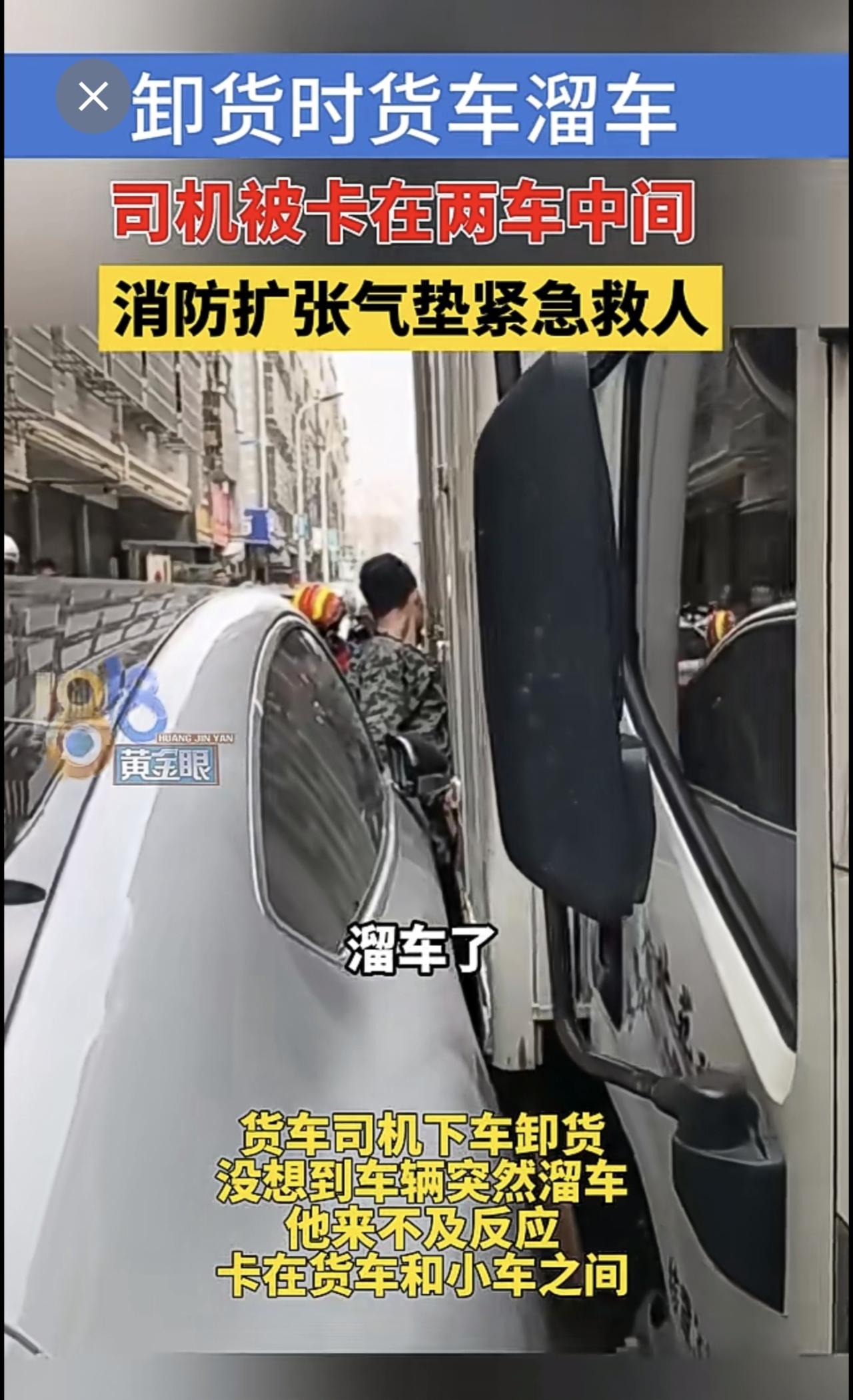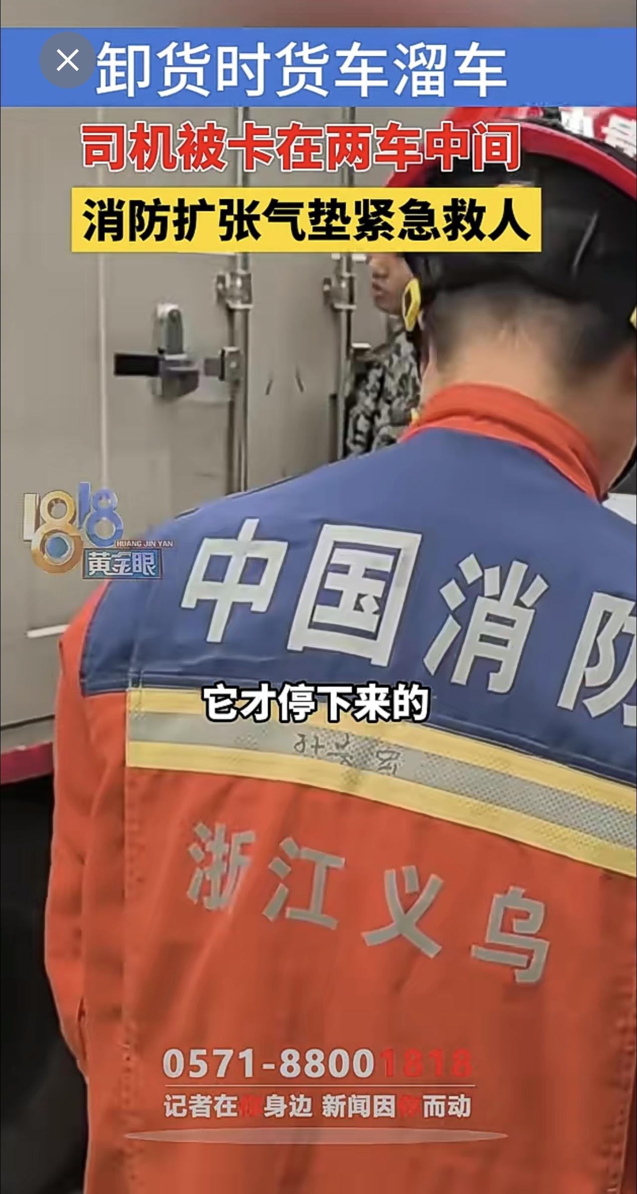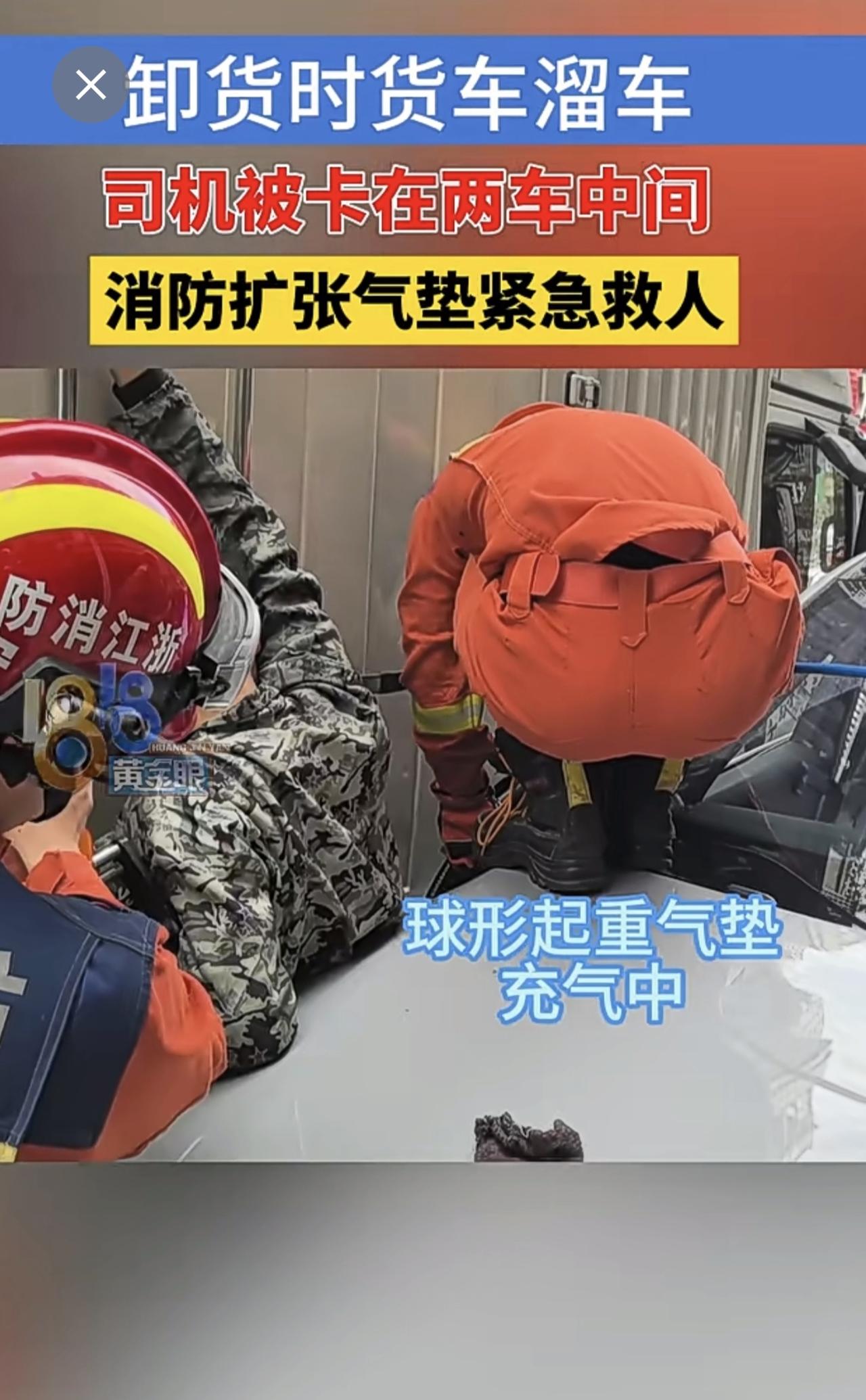 卸货时货车溜车,司机被卡在两车中间,消防扩张气垫紧急救人(供稿:义乌消防)