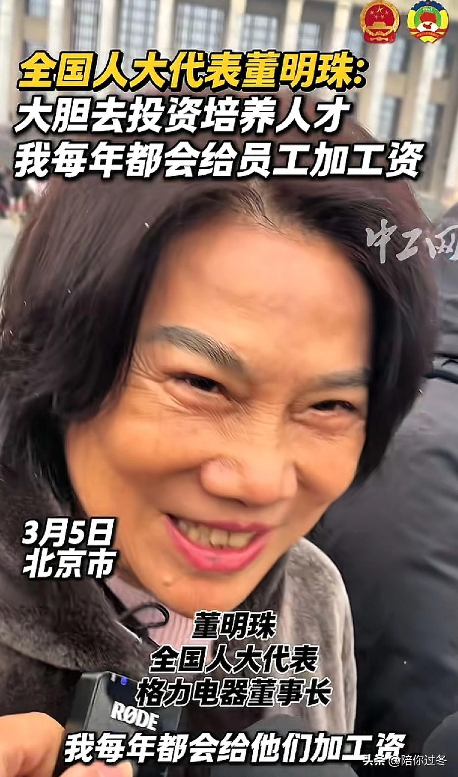 董明珠:我每年都会给他们加工资![赞] 台下的董明珠老了不少,脸上皱纹也深了,眼睛里血丝清晰可见,可见身为一家企业董事长的责任和压力是不言而喻的。 3月5日,格力董事长董明珠出席了第十四届全国人大四次会议开幕会,在前往参会途中接受了媒体朋友简单的采访交流。 董明珠对于注重人才培养提出了自己的看法,她说道:“人才培养是每个企业的需求,应该大胆的敢去投资去培养,对社会对国家都是有利的。” 此外记者还问道:“您去年说过会给员工加工资,您加了吗?” 董明珠满脸笑容的答道:“我每年都会给员工加工资”。其实她并不是嘴上说说而已,她的确也是这么干的,董明珠曾多次在媒体公共场合说过要提高普通员工待遇的言论。 董明珠是一个有爱国之心的企业家,一个有正义感的企业家一,个有良心品德高尚的企业家,您是中国企业家的标杆,向您致敬![鼓掌]格力薪资 格力涨工资