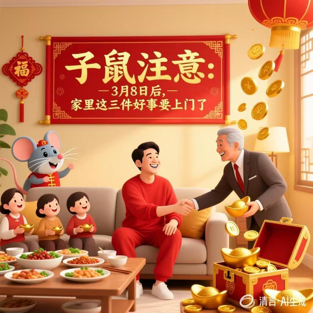 过完3月8日,属鼠人的家运就要慢慢往上走了,不用再紧绷着过日子,好事会悄悄来敲门。 先是家里越来越热闹,亲人团聚、孩子开心,日子过得有烟火气,心里踏实又温暖。 再是手头会宽松不少,之前的小付出慢慢有回报,意外小进账不断,不用再为钱发愁。 最后还有贵人上门,或是老朋友带来新机会,聊聊天就能碰到转机,事业也跟着顺起来。 把家里收拾亮堂点,心态放轻松,别想太多。3月8日之后,属鼠人只管接住好运,日子越过越顺,福气稳稳进家门。