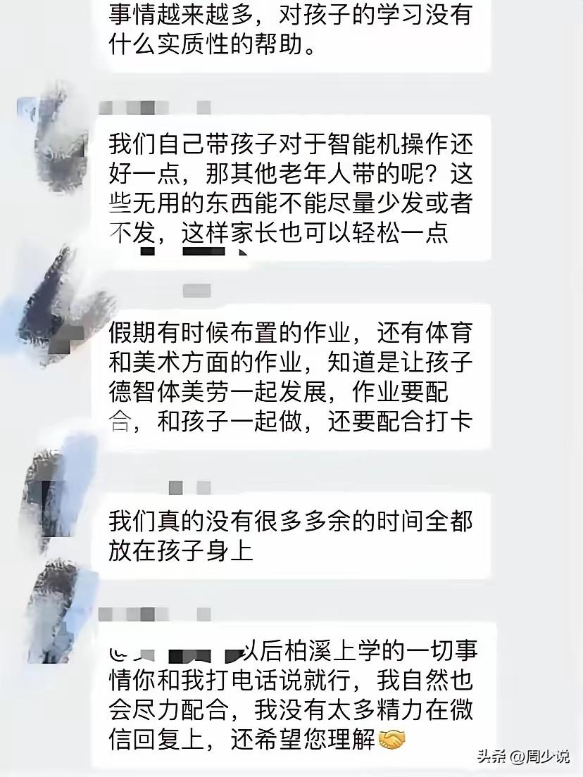 “太扎心了!”近日,一位宝妈在孩子班级群里的一番发言,意外刷屏家长圈,引发全网共鸣。这位妈妈在群内直言,当初家校群建立的初衷,是为了方便老师沟通、助力孩子成长,可如今却变了味。频繁的表格填报、试卷打印、各类打卡任务,让家长疲于应对。 她坦言自己并非全职妈妈,没法做到随叫随到,而不少留守孩子由老人照料,对智能手机操作本就生疏,这些繁琐任务,非但没帮到学习,反倒成了全家的负担。 就连假期里的体育、美术实践作业,也需要家长全程陪同、拍照打卡,普通家庭实在抽不出大把时间耗在这些事上。最后她恳请老师,后续孩子的事宜直接电话沟通,自己会全力配合,实在没精力时刻盯着微信回复。 这番吐槽一出,群里瞬间安静,不少家长私下纷纷附和。有网友直言:“太真实了!现在的家校群,早就不是沟通渠道,而是压力来源,老人带娃的家庭更是难上加难。” 还有人说:“不是不配合学校,是形式化的任务太多,反而忽略了教育本质。” 看完这位宝妈的话,周三想说家校共育的核心,从来不是让家长成为老师的“助理”。学校布置任务,初衷是助力孩子全面发展,可一味追求形式化的打卡、填表,脱离了多数家庭的实际情况,反倒违背了教育的初心。 而且,教育的重心,该回归孩子本身。不妨多一些务实的教学安排,少一些繁琐的形式主义,兼顾双职工家庭、隔代照料家庭的难处。 可见,真正的家校协同,是彼此理解、各司其职,让家长少些无奈,让教育回归本真,这才是家校共育该有的样子。#寻美三湘# #周少说教育# #寻美三湘#