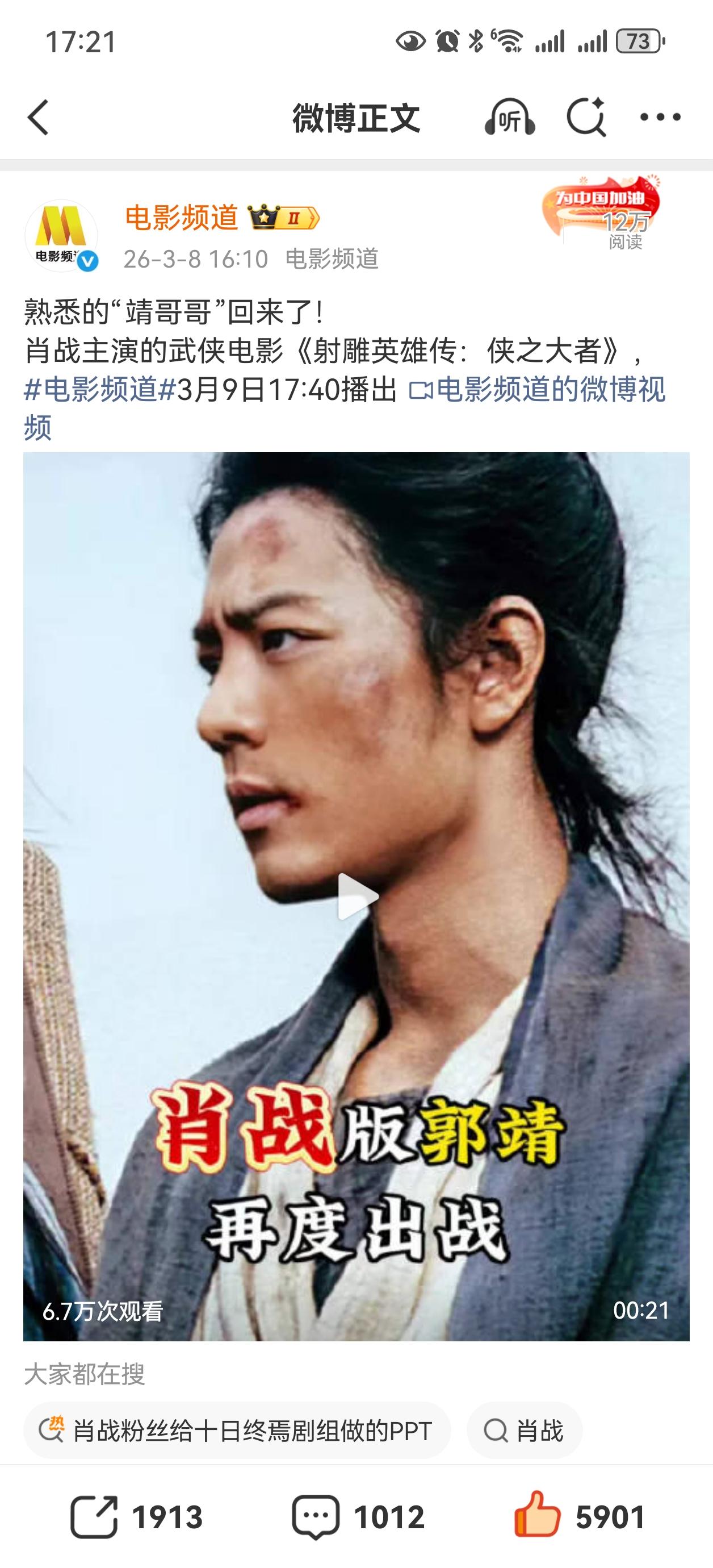 明天下午五点四十,六公主频道又双叒叕的要放肖战主演的射雕英雄传之侠之大者,六公主一旦有肖战的电影,就会反复播[呲牙][呲牙][呲牙],下一步期待在六公主看到得闲谨制,我超喜欢得闲谨制,这部电影让黑们的大本营都对肖战的演技认同[呲牙][呲牙][呲牙]