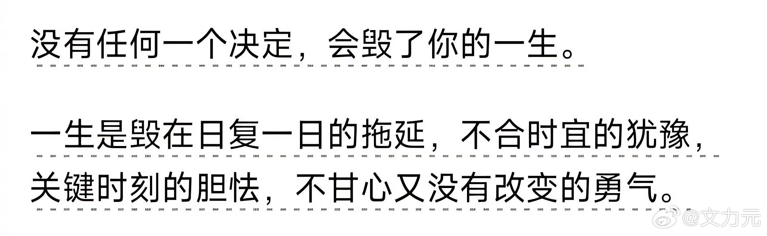 没有任何一个决定会毁了你的一生,反倒是日复一日的拖延会毁掉你,人生的容错率是很高的,任何决定都会使你得到经验或教训,总归是好事,什么都不做,才会让你越来越碌碌无为。