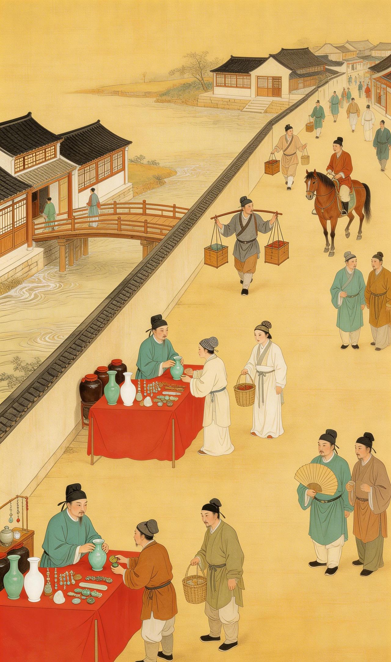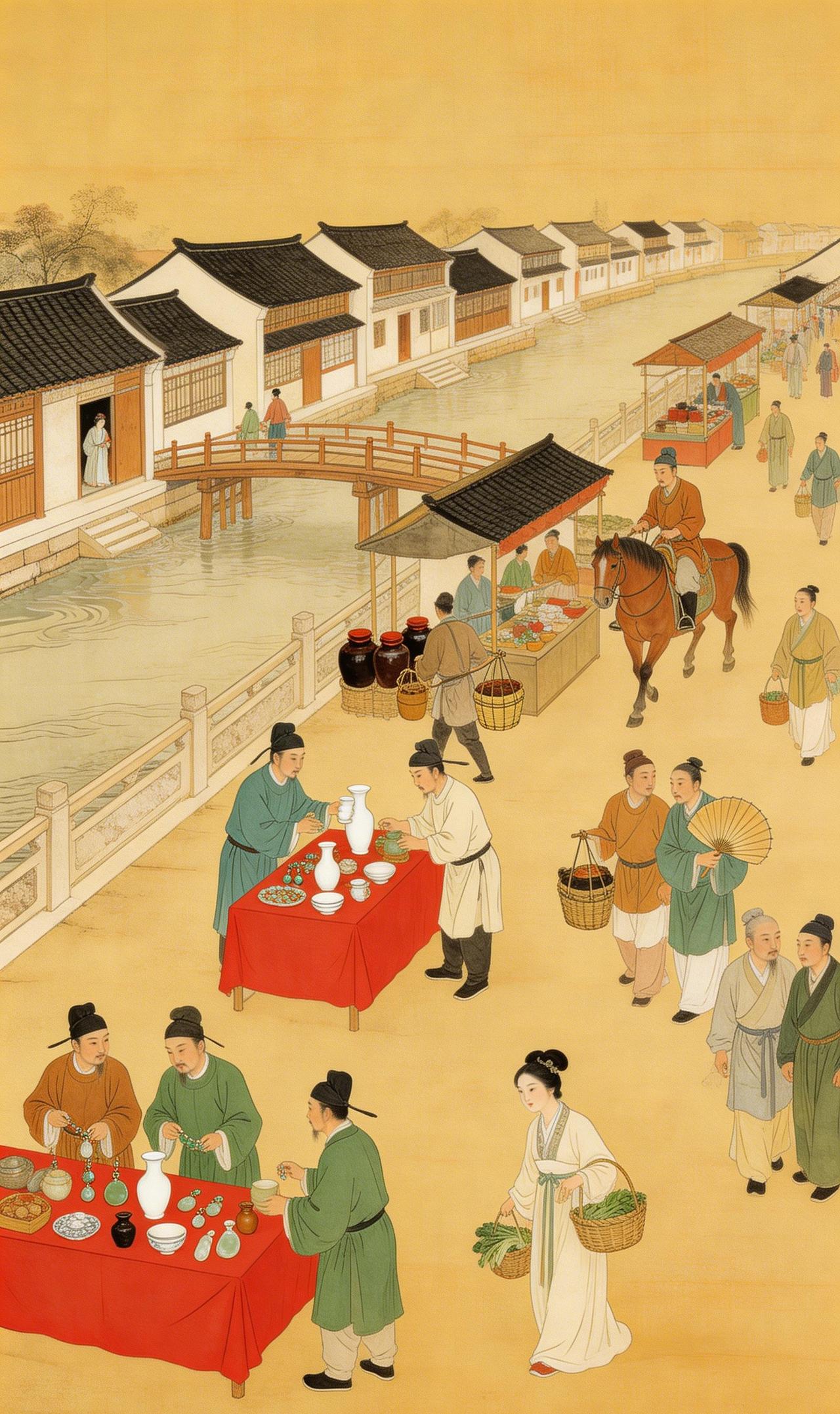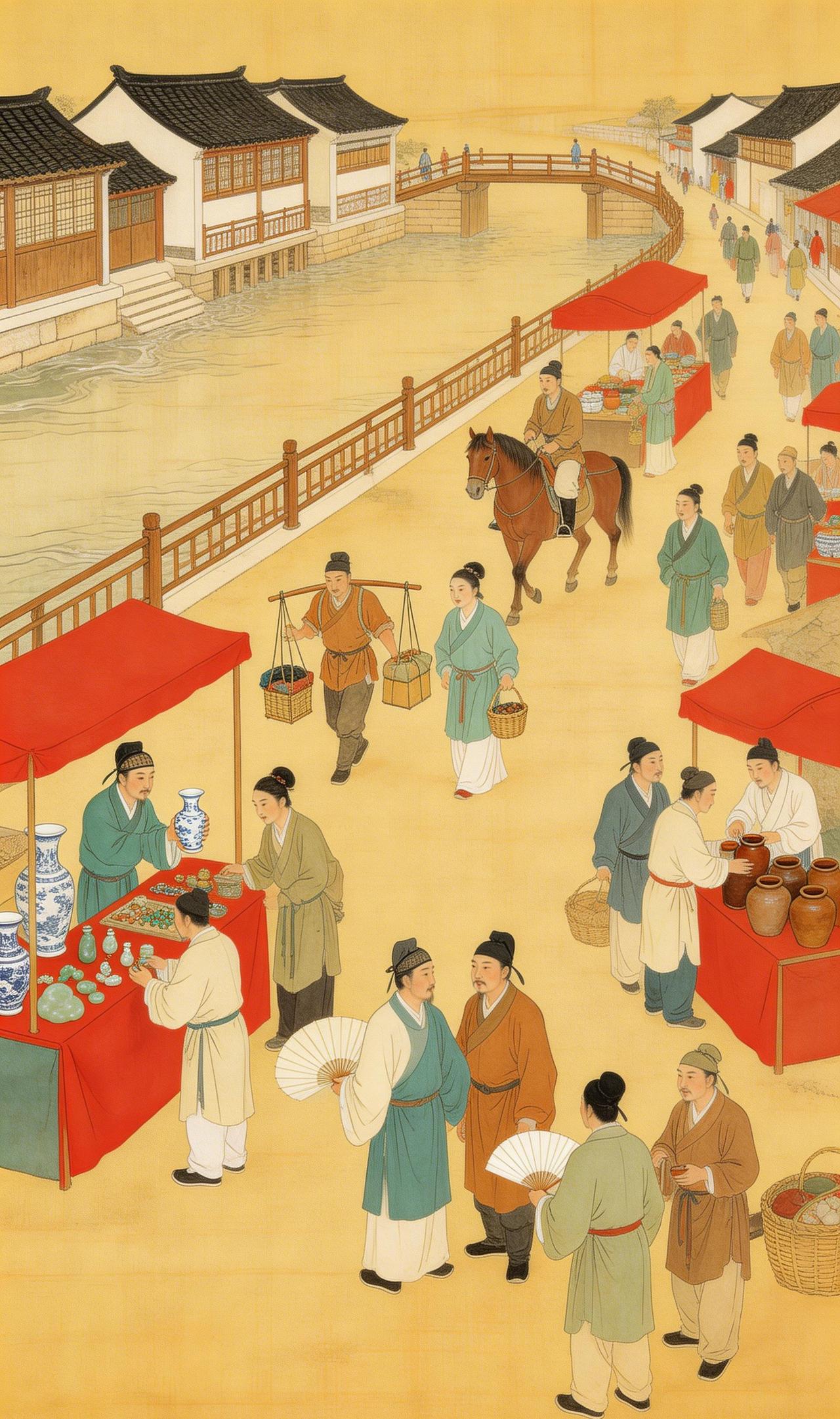 市井长卷:明代江南繁华图 青绿衣衫攒动处,红布摊前瓷瓶温。货郎担挑四时鲜,书生摇扇过廊桥——五百年前的江南市声,正从绢本上漫溢而出。 长卷徐展,见临河瓦舍次第排闼,木廊桥连两岸烟火。三十余位市井人物各具情态:老者俯身鉴玉器,妇孺驻足选竹篮,酒旗斜矗处有人卸担歇脚,马蹄嘚嘚间闪过赭色短褐。米白襕衫与青色网巾交织成流动的街河,油纸扇轻摇出市井闲情,货箱里瓷瓶与酒坛相撞,仿佛能听见叮当脆响。 画师以纤毫之笔,将喧嚣酿成秩序——人物疏密如棋局,动线蜿蜒似流水。那些隐在瓦檐后的炊烟,廊柱旁斜倚的扁担,河埠头浣衣人溅起的水痕,皆在诉说:这便是明代最鲜活的烟火人间。 古画 古代市井 明代生活