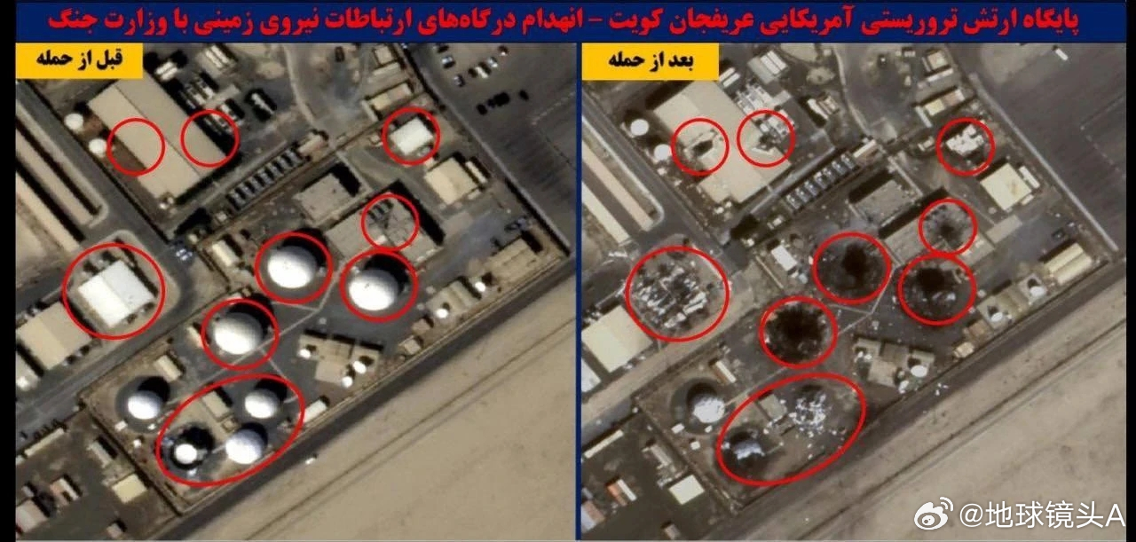 伊朗亮底线 事件与结果大伙都知道了。精度如何?还有人嗤之于鼻么?第一张照片中,据推测是位于约旦穆瓦法克 - 萨尔蒂基地的末段高空区域防御系统(THAAD)中的 AN/TPY-2 雷达被摧毁。此外,科威特阿里夫詹基地的卫星图像显示四处建筑物、仓库以及 7 个卫星通信天线中的 6 个遭到打击并被摧毁。