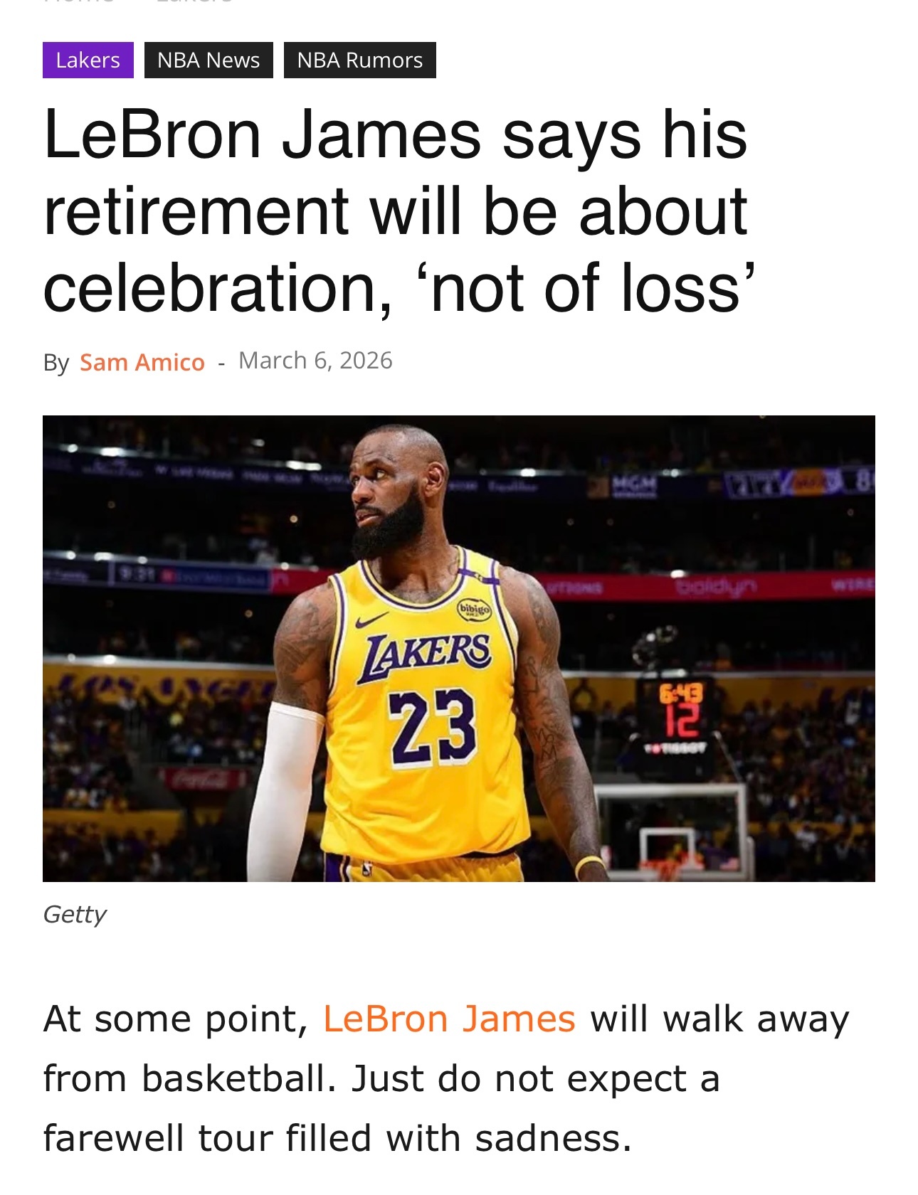 总有一天,勒布朗·詹姆斯会告别篮球赛场。但别指望他会开启一场充满伤感的告别巡演。