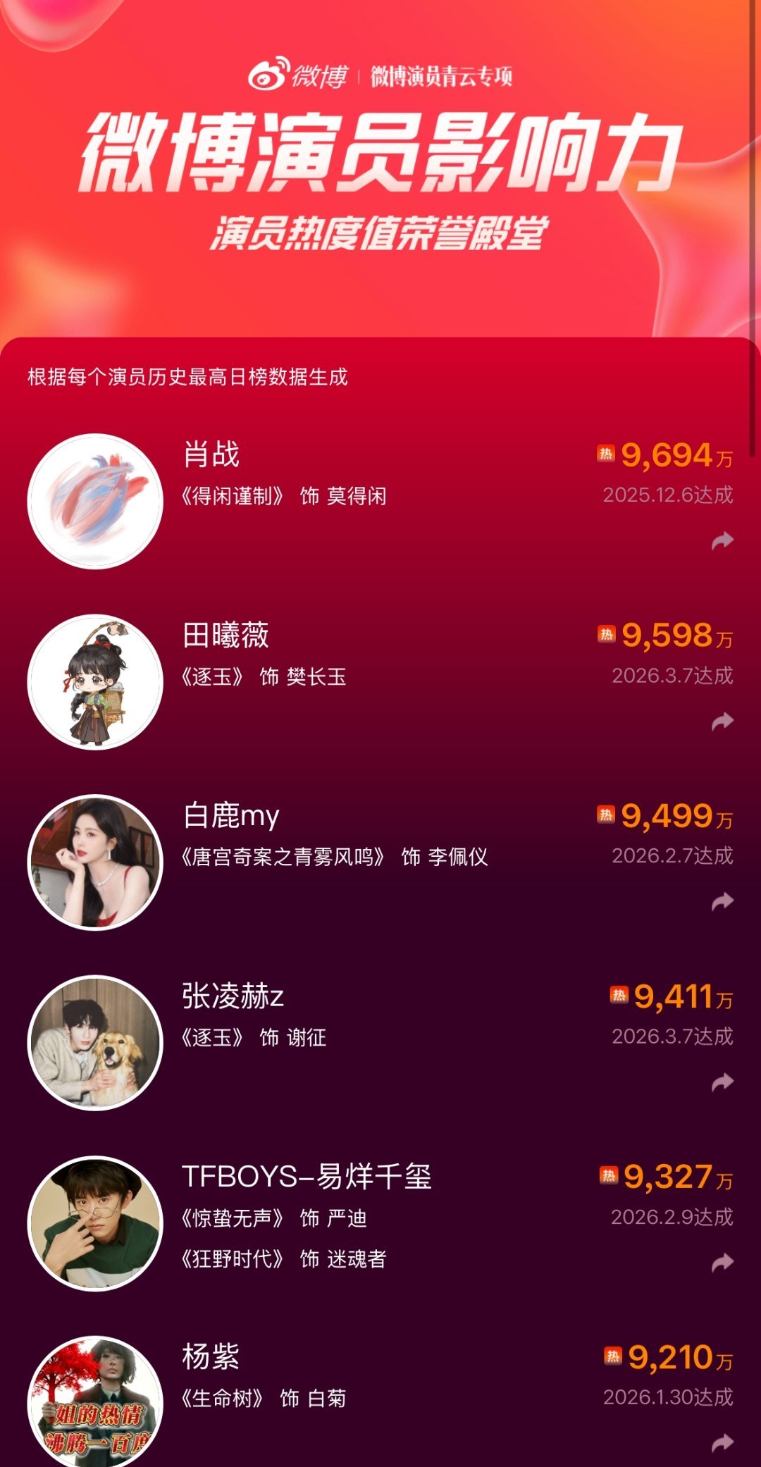 田曦薇演员热度值破9500万田曦薇演员影响力热度值破9500万看着田曦薇从开播到现在一路稳步上涨,V榜破9,热度值直接破9500万,所有努力都被看见,所有付出都有回响,真的替她开心。