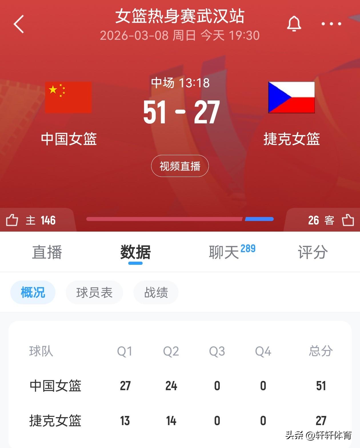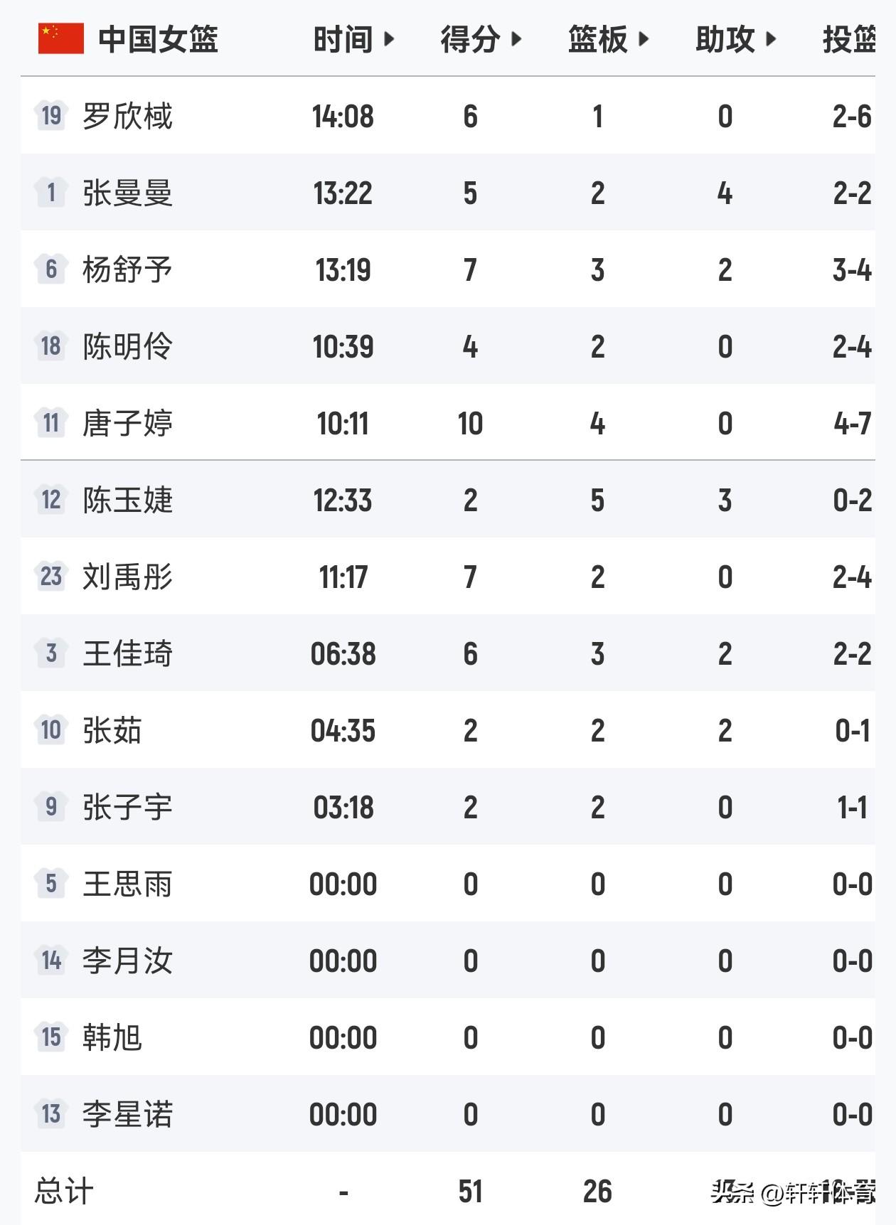 中国女篮热身赛上半场结束,半场比分中国女篮以51-27领先捷克女篮24分,可以说今天女篮上半场比赛,是最近三场比赛打的最好的上半场,尤其球队外线三分球今天发挥的也很优秀,半场三分球14投8中,投篮是33投18中,上半场比赛感觉教练组更喜欢使用刘禹彤,半场比赛出场11分17秒贡献7分2篮板,张子宇仅获得了3分18秒的出场时间得到2分2篮板,中国女篮半场得分最高的是唐子婷10分4篮板,杨舒予7分,罗欣棫,王佳琦各有6分入账,张曼曼5分,陈明伶4分陈玉婕,张茹各有2分,本场比赛李月汝,韩旭,王思雨,李星诺都出现在大名单,但是上半场都没有出场,不知道下半场宫指导是否会给他们几个出场机会。