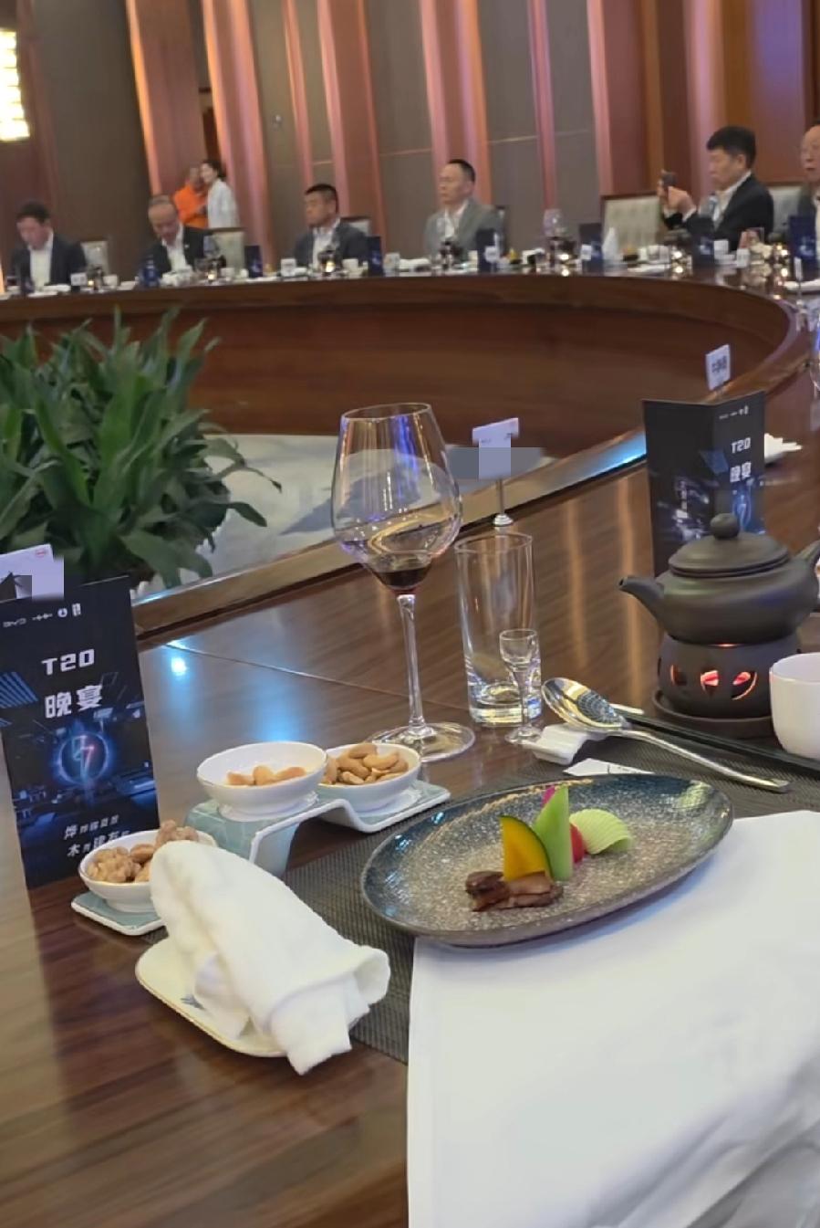比亚迪经销商晚宴,深圳总部食堂自助餐房间,超大圆桌,中间装饰景色亮了,一片一堆绿油油玉米棵,还搞了篱笆,很真实,可是有一点奇怪,集中在一个区域? 再看吃的啥,中餐分餐制,每人一份餐卡名牌,菜单,高脚红酒杯,玻璃杯饮料,简单水果拼盘,简单小菜,这样的是每人一个,有烧火加温底座的烧水瓷壶,很有商务氛围!