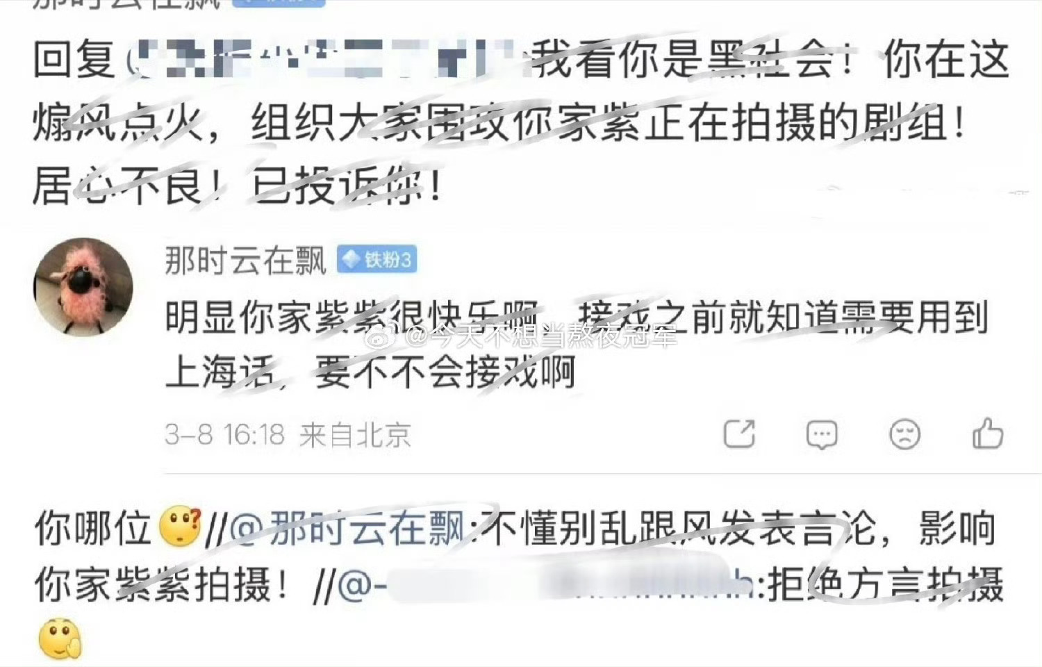 杨紫粉丝不允许剧组用上海话拍摄,疑似《玉兰花开君再来》剧组和杨阳工作室相关人员威胁杨紫粉丝,问粉丝还想不想杨紫演戏了,说杨紫进组前就知道要使用方言。