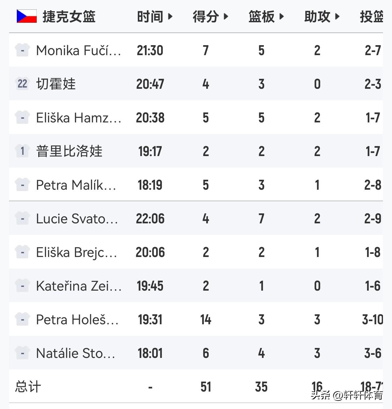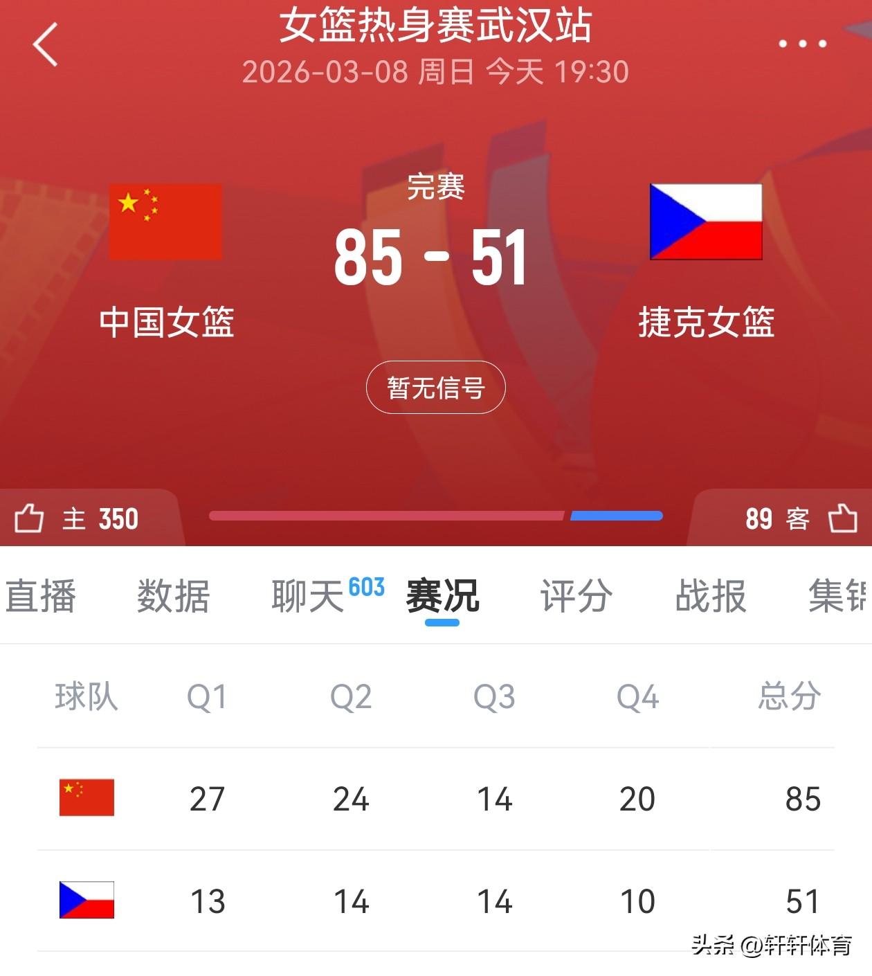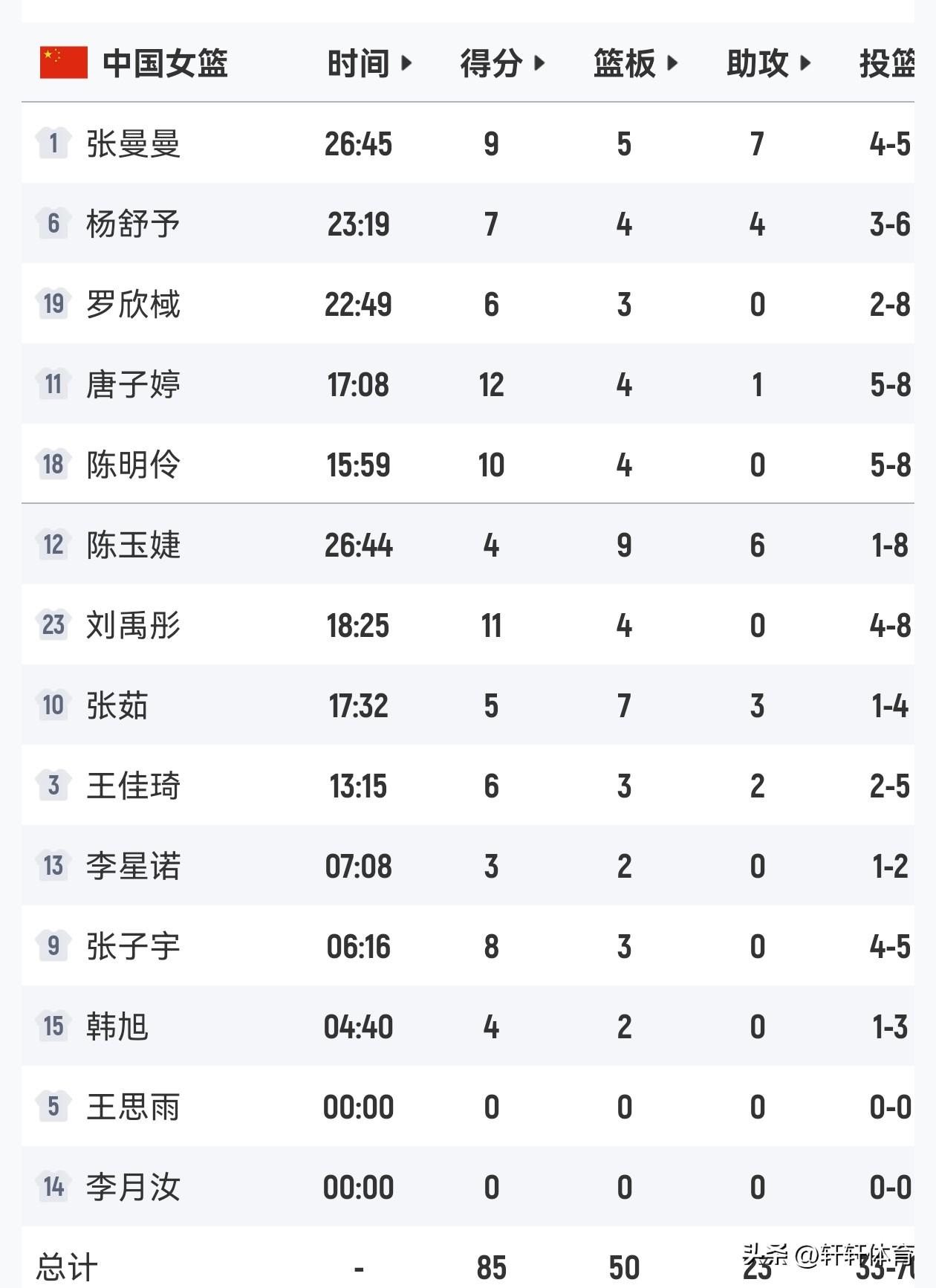 中国女篮世预赛前最后一场热身赛今天结束,中国女篮兵不血刃的以85-51战胜世界排名第17位的捷克女篮,取得了热身赛的第三场胜利,本场比赛中国女篮李月汝,韩旭全部归队并出现在大名单中,韩旭还在下半场登场了4分40秒,并得到了4分2篮板的数据,李月汝以及前两场热身赛表现不错的王思雨本场比赛没有登场,中国女篮本场比赛得分最高的是唐子婷出场17分08秒,得到了12分4篮板1助攻的数据,刘禹彤出场18分25秒得到了11分4篮板,陈明伶出场15分59秒得到10分4篮板,张曼曼出场26分45秒得到了9分5篮板7助攻的全面数据,张子宇出战6分16秒得到8分3篮板,杨舒予出场23分19秒得到了7分4篮板4助攻的全面数据,罗欣棫,王佳琦各得到6分,张茹5分7篮板3助攻,陈玉婕4分9篮板6助攻,李星诺3分,截止中国女篮世预赛前热身赛全部结束,接下来就是迎接马上开始的世预赛武汉赛区的比赛。