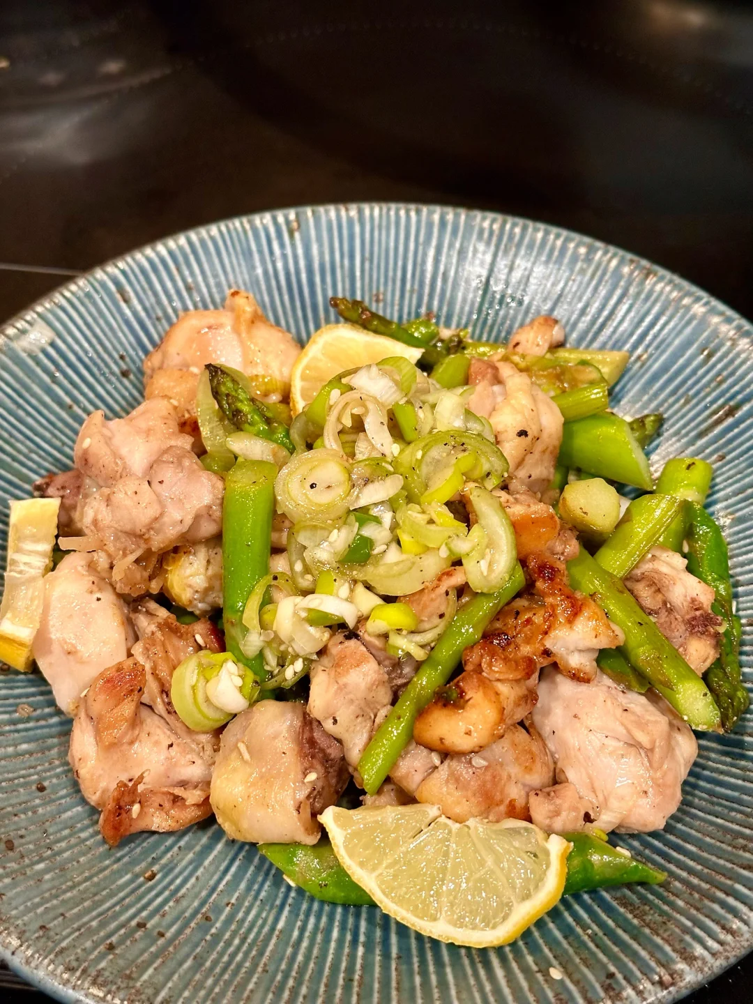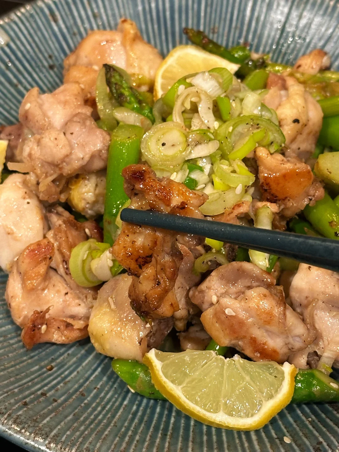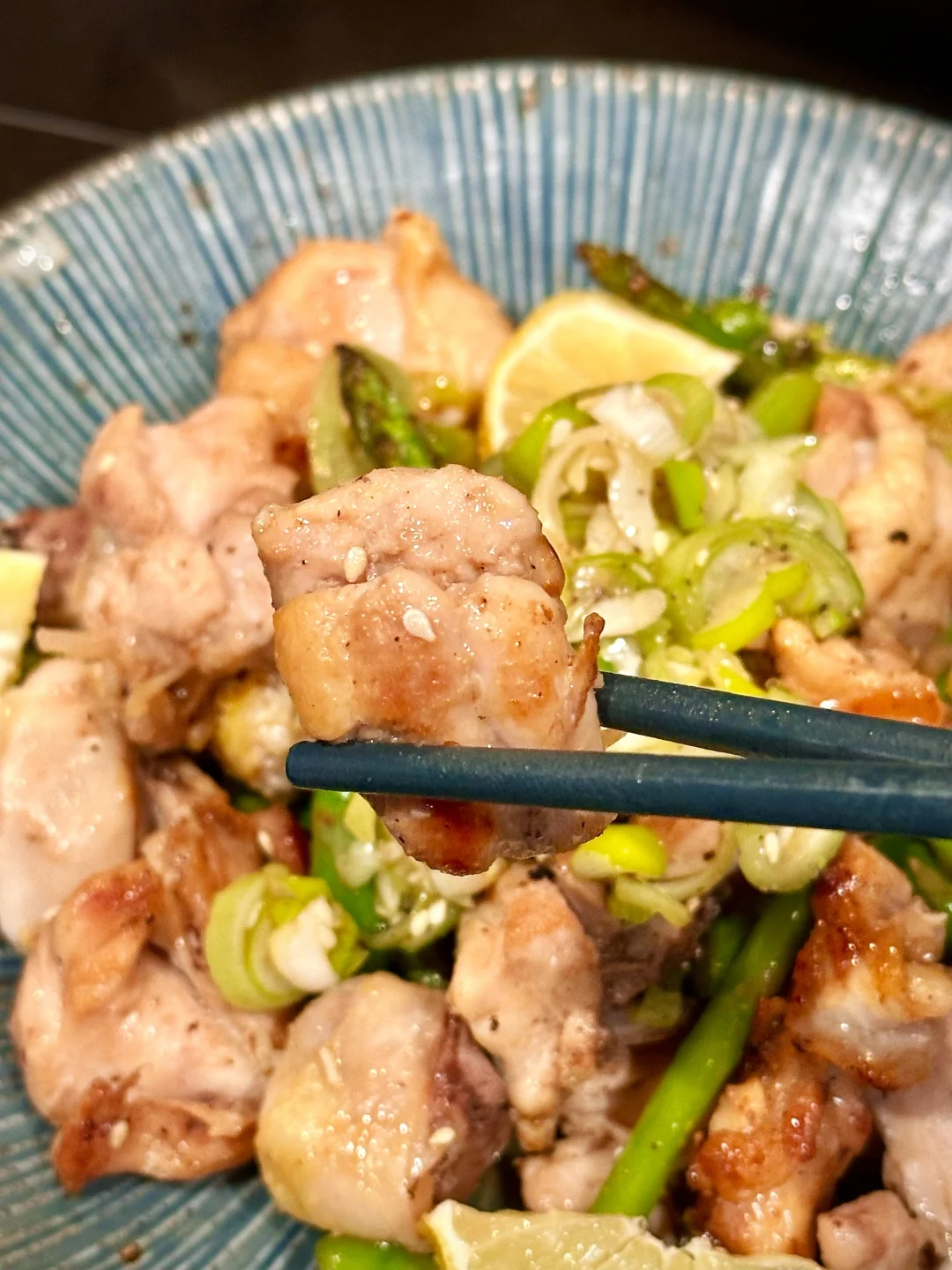 已经过够了这个漫长的冬天,刚刚感知到一点要回暖的迹象,我就忍不住想做些带点春日气息的清新美味了! 暂时把炖菜汤菜先放放,浓郁的牛羊肉留在冬季。初春的季节我决定用柠檬盐葱酱搭配鸡腿肉,香气清新,口感利落。还要加入碧绿的芦笋,样子就像春天里抽长的纸条,看着就爽口有食欲。 - 📒食材 鸡腿3只,米酒,盐,白胡椒粉,食用油,芦笋一把 盐葱酱:大葱一根,姜末一小勺,糖一小勺,dashi粉或鸡粉一小勺,味淋一大勺,芝麻油一小勺,白芝麻适量,ponzu一大勺,柠檬1/4个的汁 - 📖做法 鸡腿切块,我用带骨的感觉口感更好,你也可以用去骨鸡腿排方便切,加米酒,少许盐和白胡椒粉腌制十分钟; 大葱先斜切不切断,再切末。和其他盐葱酱的食材混合,盐葱酱就完成了; 锅里喷油,放上鸡腿先两面煎上色,再加入芦笋翻炒,淋入米酒,盖上锅盖小火焖三分钟; 揭开锅盖,倒入大部分的盐葱酱,快速翻炒均匀后出锅; 顶上再舀余下的盐葱酱,点缀柠檬片,就可以享用啦! - 虽然这道菜很清淡,也挺健康,但相信我,完全不会寡淡,调味很丰富,配米饭或者夹在面包里也完全没问题! -