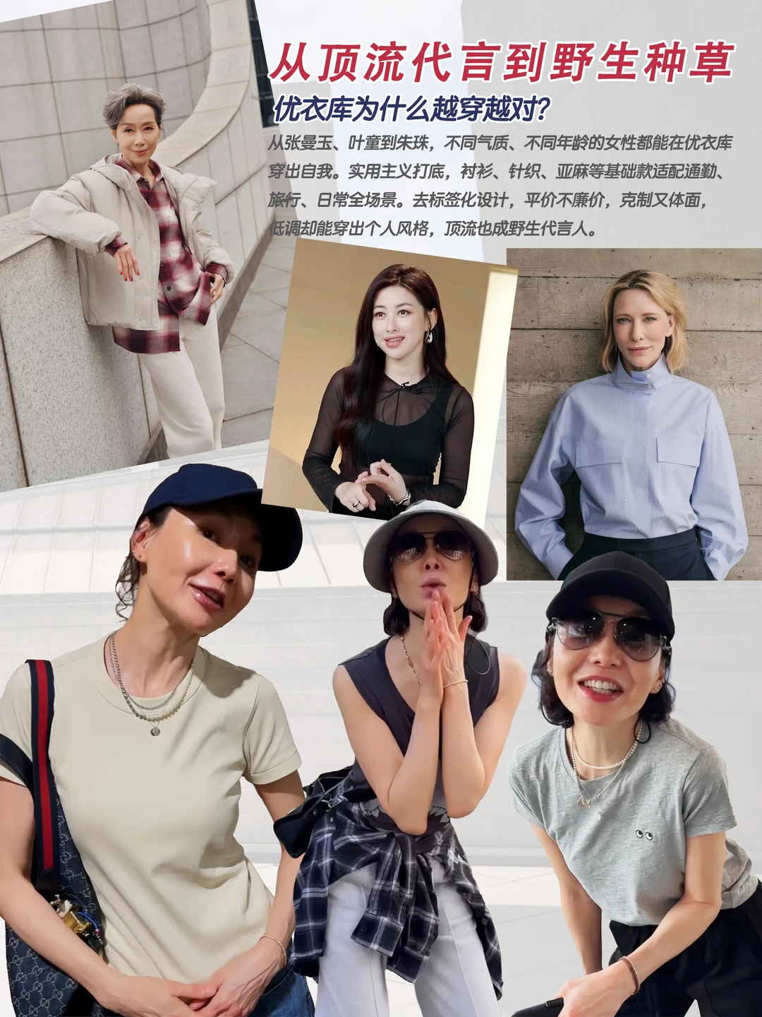 这种气质很符合优衣库一直在讲的 LifeWear——衣服不需要很夸张,但要好穿、耐穿,而且能陪你很久。从明星私服来看,很多人早就把优衣库穿进日常:像 张曼玉、叶童、朱珠,私下都很爱穿这种简单又舒服的基础款。