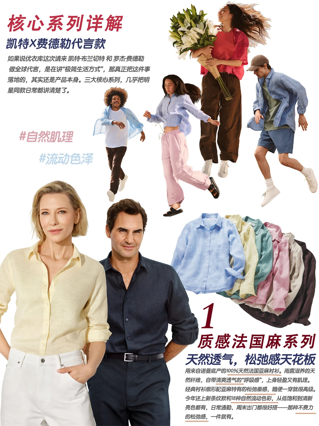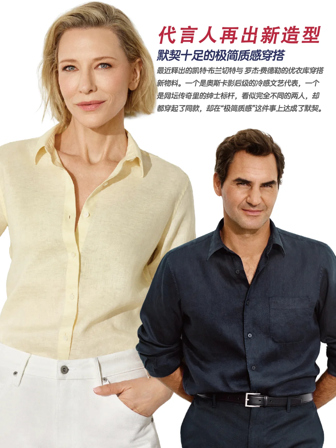 奥斯卡影后 凯特·布兰切特 和网坛传奇 罗杰·费德勒又又又穿上优衣库了!一个是冷静优雅的电影女主气质,一个是从容克制的绅士运动员,看起来风格完全不同,却在“极简品质”这件事上默契度极高。
