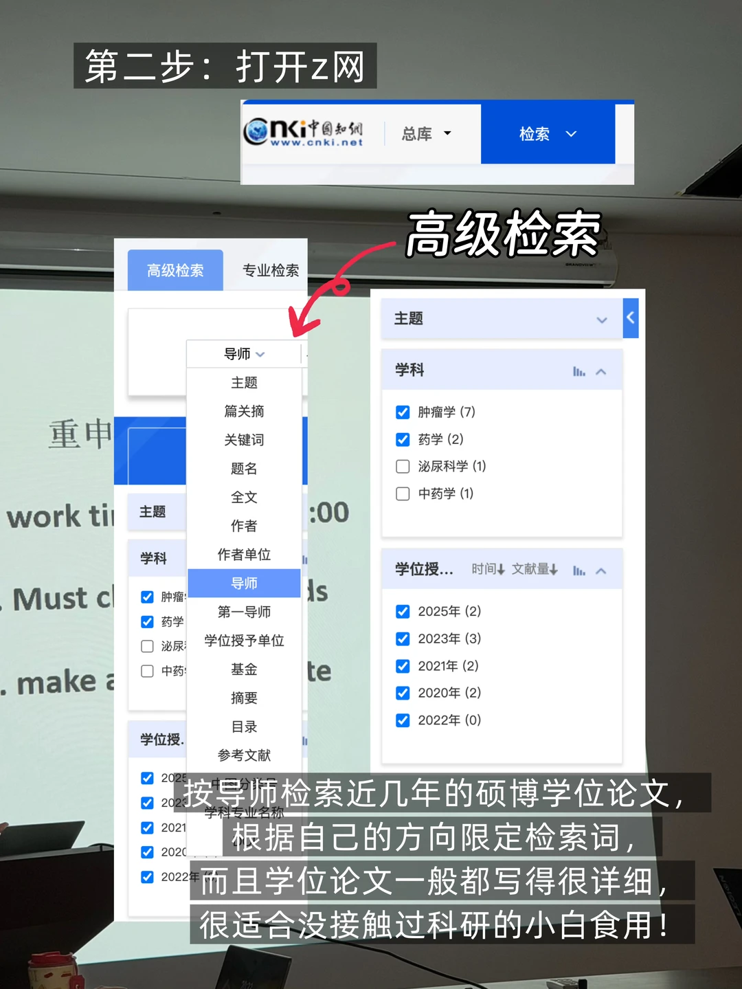 [二R]打开z网,按导师检索近几年的硕博学位论文,我个人更建议学位论文且是近几年的,因为学生做的东西和导师的研究方向最贴合,而且学位论文很适合没接触过科研的小白食用!一个导师搜2~3篇代表性的就可以!