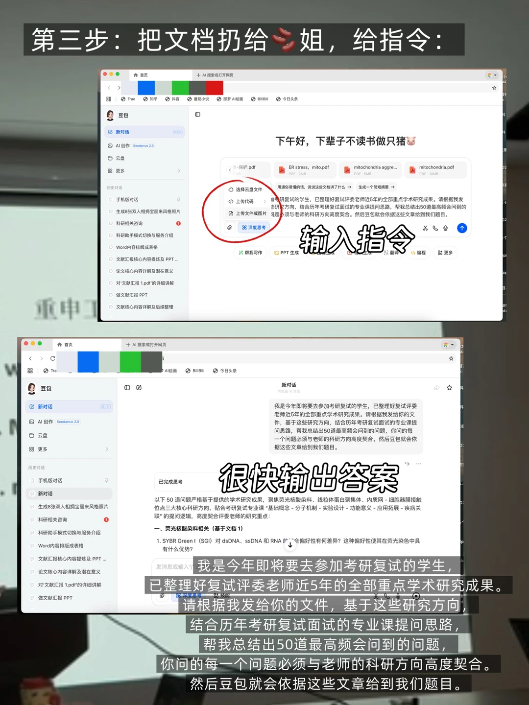 [三R]因为复试准备时间不充裕,我们要快速了解这些考官的研究内容,把这些文章统统扔给豆老师,把文档上传给豆姐,让豆姐根据这些文章总结出30~50道高频会问到的问题!这些问题很可能就和考官问的东西有重合之处的。输入指令可以参考图中的‼️