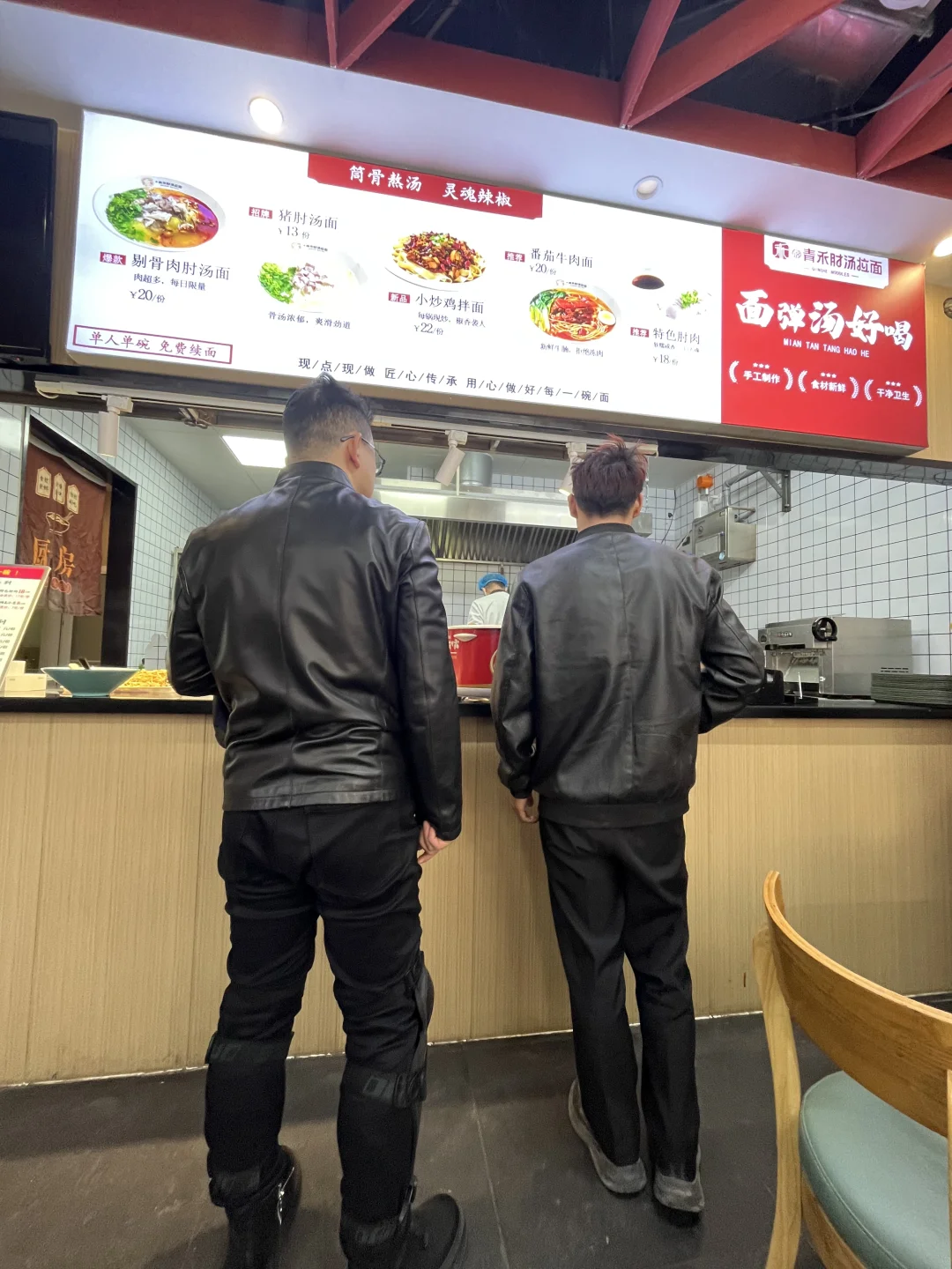 好吧!那就去隔壁,那家青禾拉面,主打一个肘汤噱头。肘子吃过不少,但肘汤面还是头一遭见。从窗外望进去,座位全满,那就推着行李箱,直接杀进去,找个空座等位再说!不知道吃啥,想到晚上同学聚会有大餐,简单点吧!肘汤拉面,加一张干子,完事儿!