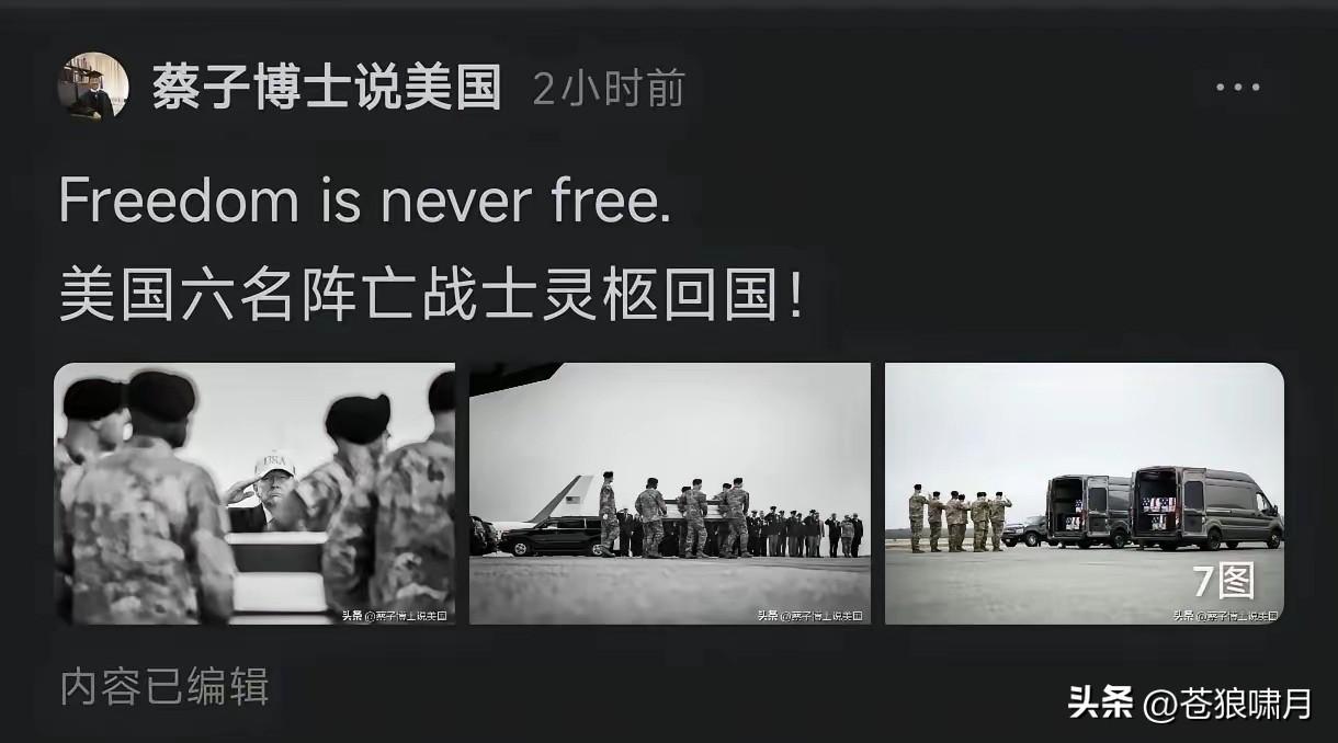 川普与他的内阁,迎接美伊冲突阵亡美军遗体回国!他与万斯及防长等军方参与迎接,场面肃穆令人感伤! 画面中众人庄严列队,接迎士兵走向飞机。川普肃立机舱口迎候。士兵抬棺而出,众人举手敬礼致以哀悼! 感伤之余,见蔡子博士也有报道:美国6名阵亡士兵灵柩回国!苍狼质疑:有人说500名美军阵亡,是假的? 不管阵亡多少,都是不应该的,若没有美伊冲突,这些士兵会阵亡吗?伊朗方面应该更多?这都是为什么? …………