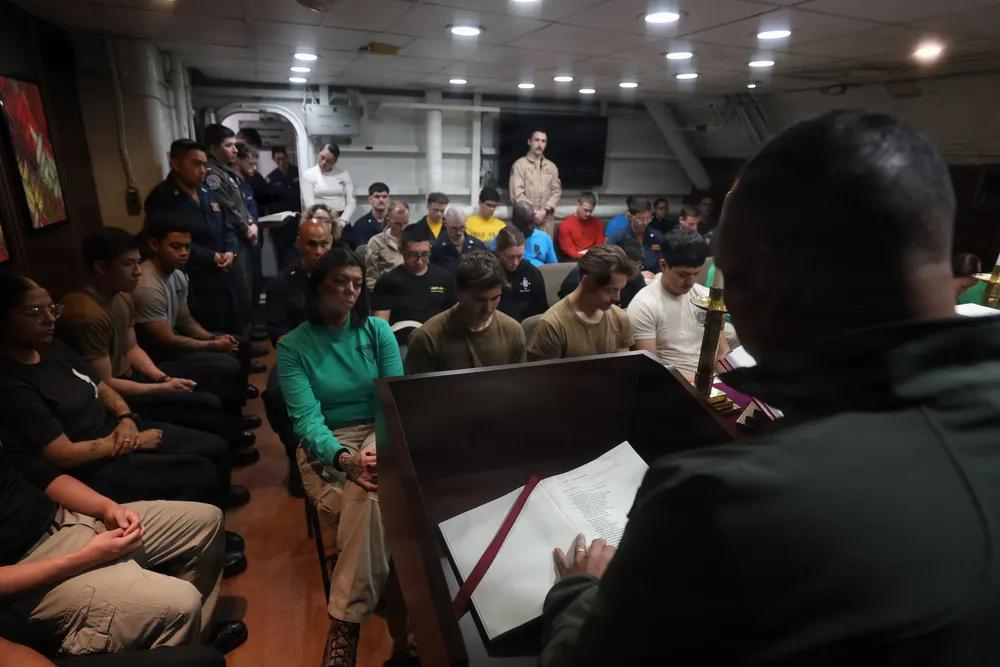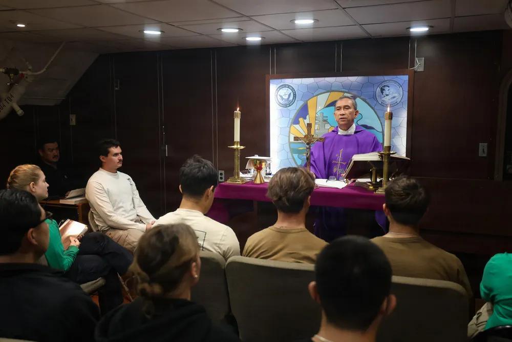 美军也是非常奇特,一边进行战争,一边进行宗教活动。 美国海军中校爱德华多·阿莫拉,尼米兹级航空母舰亚伯拉罕·林肯号(CVN 72)的牧师,弥撒中发表讲话。亚伯拉罕·林肯号部署至美国第五舰队作战区,支持中东的海上安全与稳定。